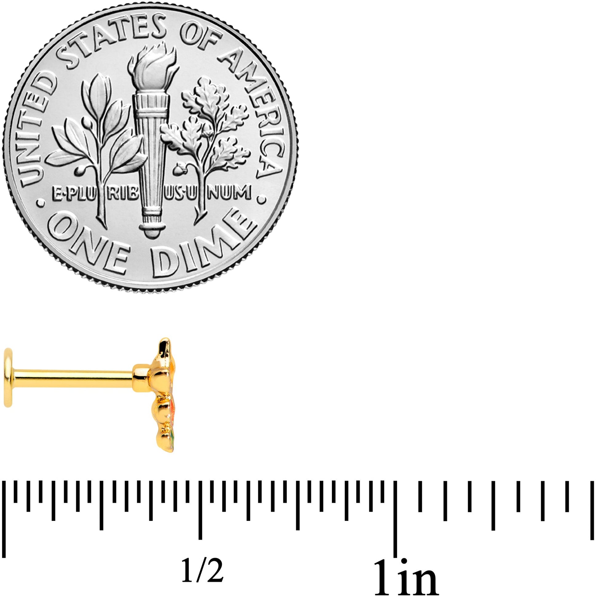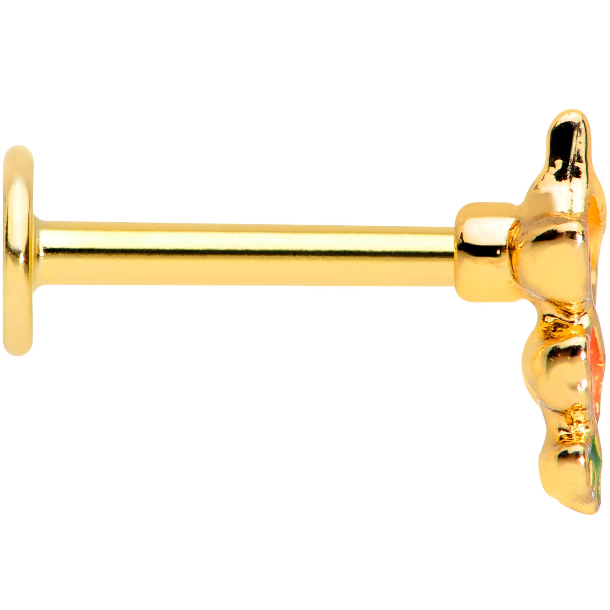 You're totally going to fall for this 16 gauge lip ring! It's made with an 8mm gold tone PVD over 316L surgical grade stainless steel straight barbell with a flat disc end. It features a charm of three abstract forms, inspired by the falling leaves. They're yellow, orange, and green and set in descending size order for maximum visual impact. You can even wear this in multiple piercings including lip, monroe, tragus, helix, and some conch piercings! This autumn, grab some cartilage jewelry that you're sure to fall in love with!Specifications