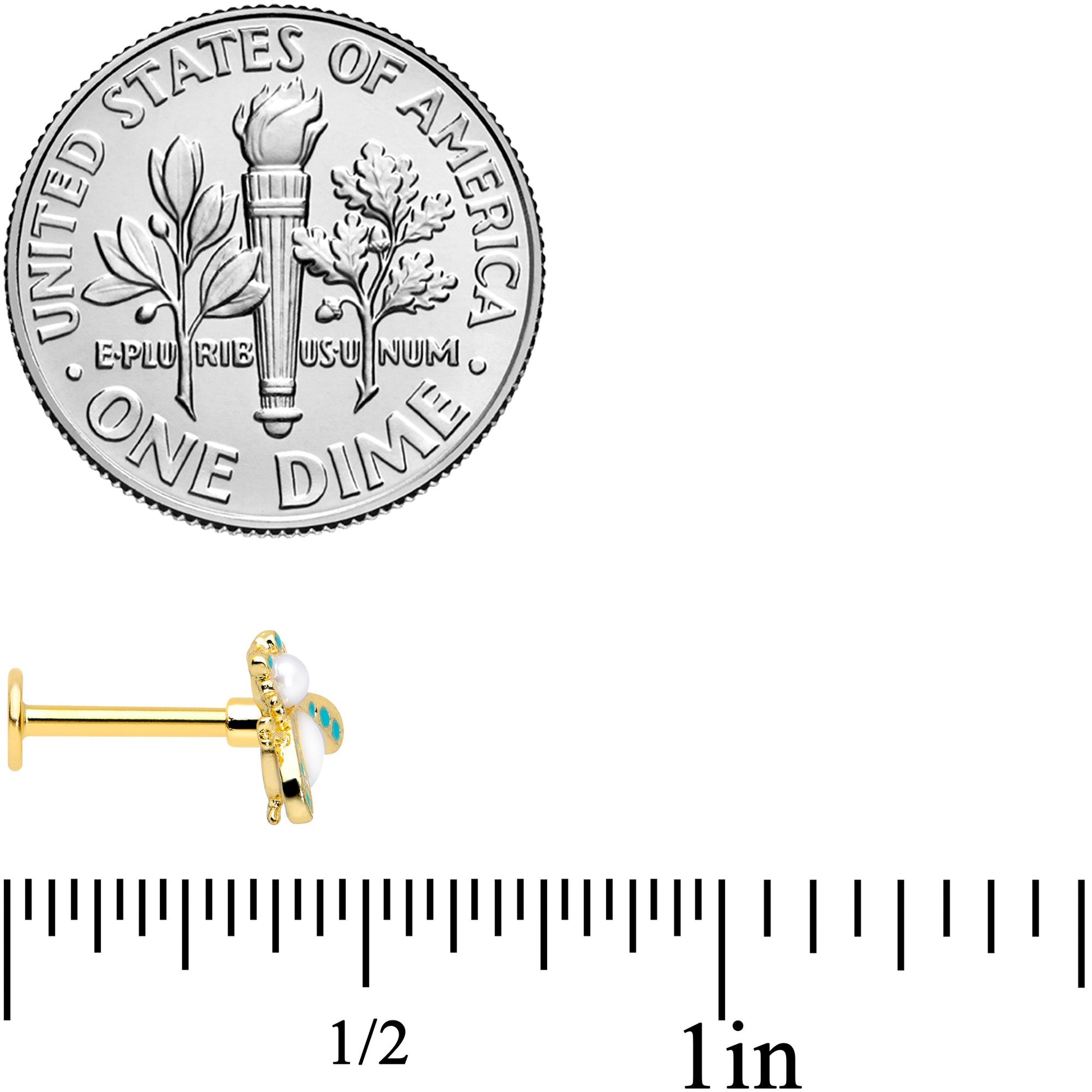 The insect on this 16 gauge lip ring has tons of wintery style! It's made with an 8mm gold tone PVD over 316L surgical grade stainless steel straight barbell with a flat disc end. It features an insect charm, with white pearlescent orbs for its body and head. The wings are set with green pearlescent orbs for a colorful and cohesive look. You can even boast this bug in multiple piercings including lip, monroe, tragus, helix, and some conch piercings! Why let winter bug you when you rock this elegant insect cartilage stud!Specifications