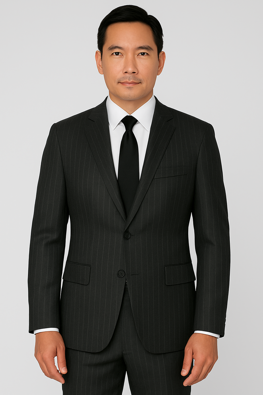 Crafted from a premium wool blend, this Tailor Fit charcoal pinstripe 2-piece suit offers a refined silhouette tailored to perfection. Its classic pinstripe pattern adds a touch of sophistication, making it ideal for professional settings or formal occasions. The suit’s tailored fit ensures comfort and a sharp appearance, allowing you to convey confidence and style effortlessly.