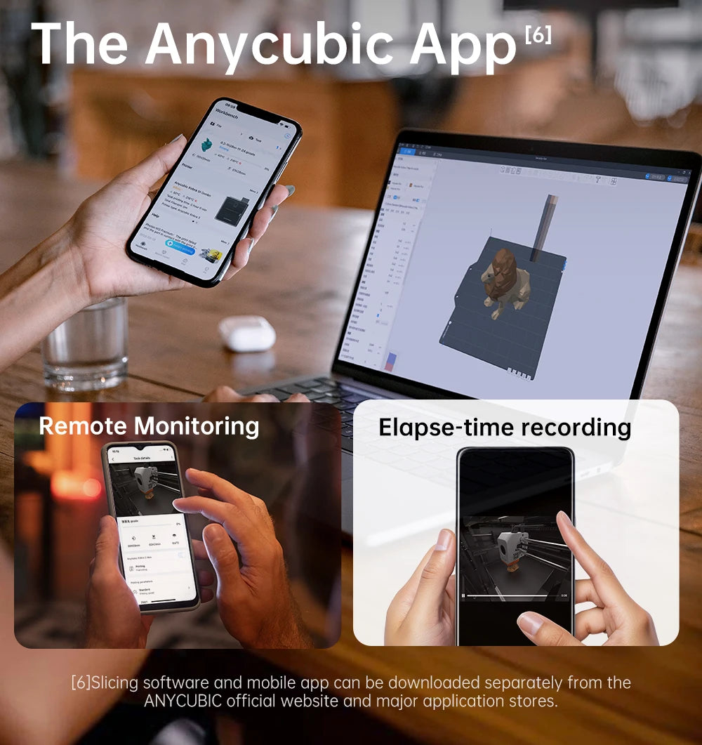 Monitor the real-time printinc status through the Anycubic app on your mobile devices,including cellphones, tablets and laptops.