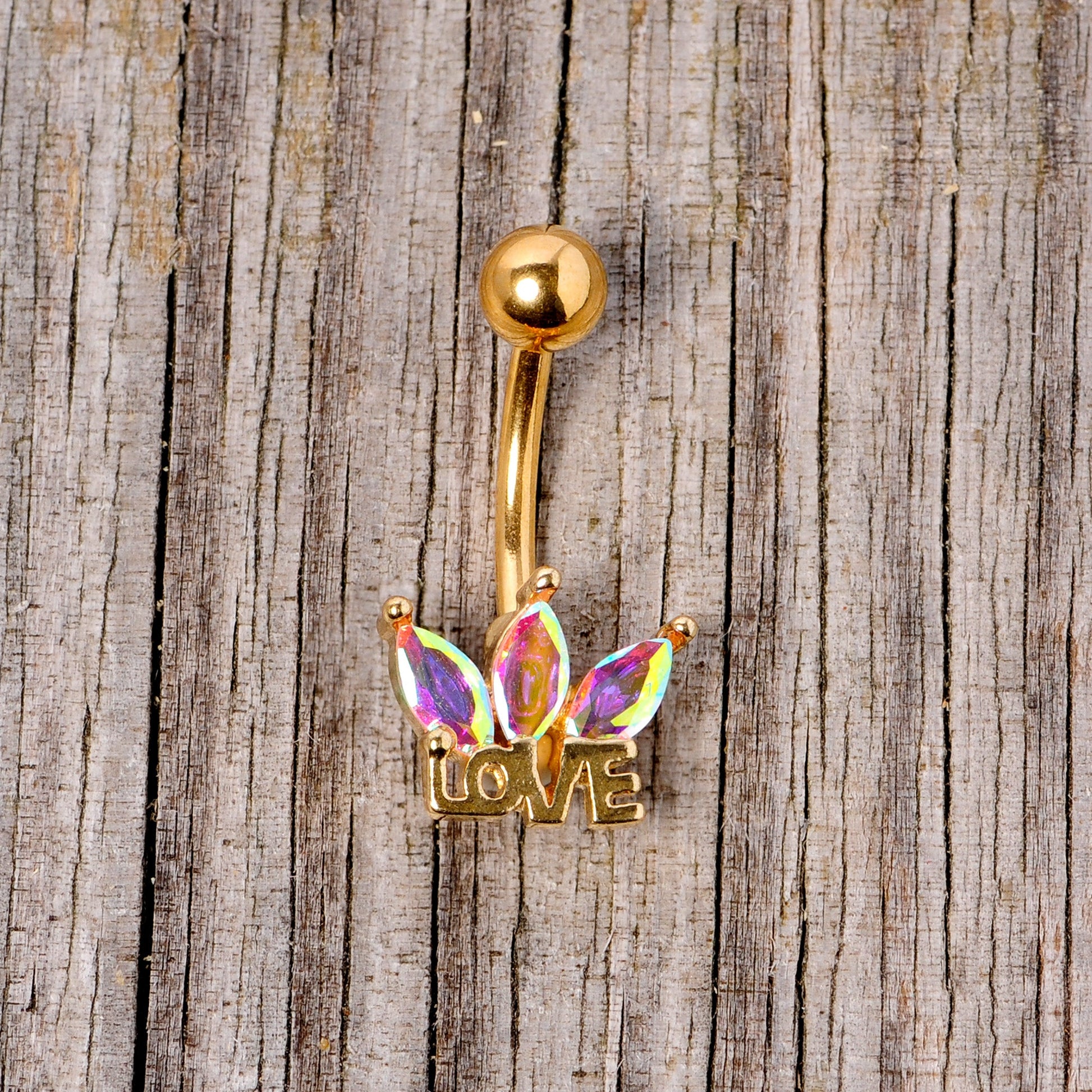 Show the world that love is king...or queen...with this 14 gauge navel jewelry! It's made with a 3/8" gold tone plated over 316L surgical grade stainless steel curved barbell with a 5mm top ball end. The bottom end features a trio of aurora color gems fanned out over the word "love" like a royal crown. Spread love whether it's Valentine's Day or not when you wear love with this elegant and timely belly button ring.
