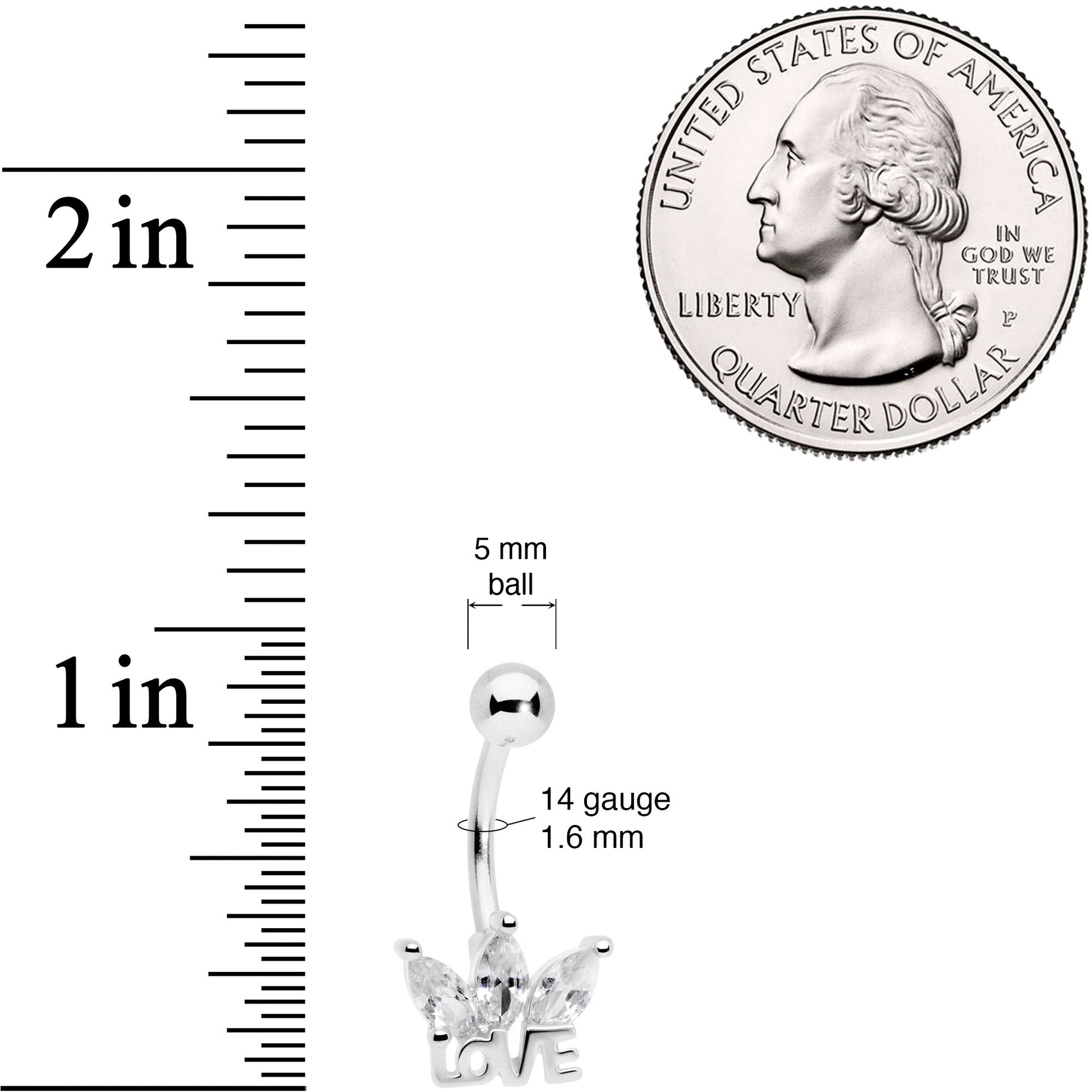 Show the world that love is king...or queen...with this 14 gauge navel jewelry! It's made with a 7/16" durable 316L surgical grade stainless steel curved barbell with a 5mm top ball end. The bottom end features a trio of clear gems fanned out over the word "love" like a royal crown. Spread love whether it's Valentine's Day or not when you wear love with this elegant and timely belly button ring.
