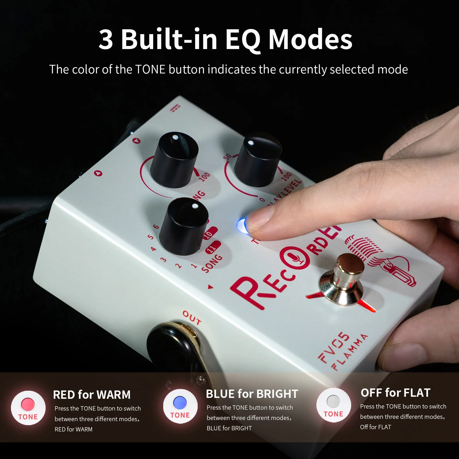The Flamma FV05 Recorder Effects Pedal is built for vocalists and guitarists who want pro-level recording and stage control in one compact unit. With 70 minutes of recording capacity spread across 11 slots, this pedal lets you capture riffs, vocal lines, and full arrangements with ease. Stack unlimited overdubs, sculpt your sound with three EQ modes (Flat, Warm, Bright), and lock in clarity using the dedicated noise gate. Vocals shine with reverb, while guitar input gets its own reverb for powerful stage-ready performance. Plus, with 48V phantom power, an auto-recording function, and XLR/unbalanced outputs, the FV05 becomes your one-pedal powerhouse for recording, rehearsals, and live gigs.