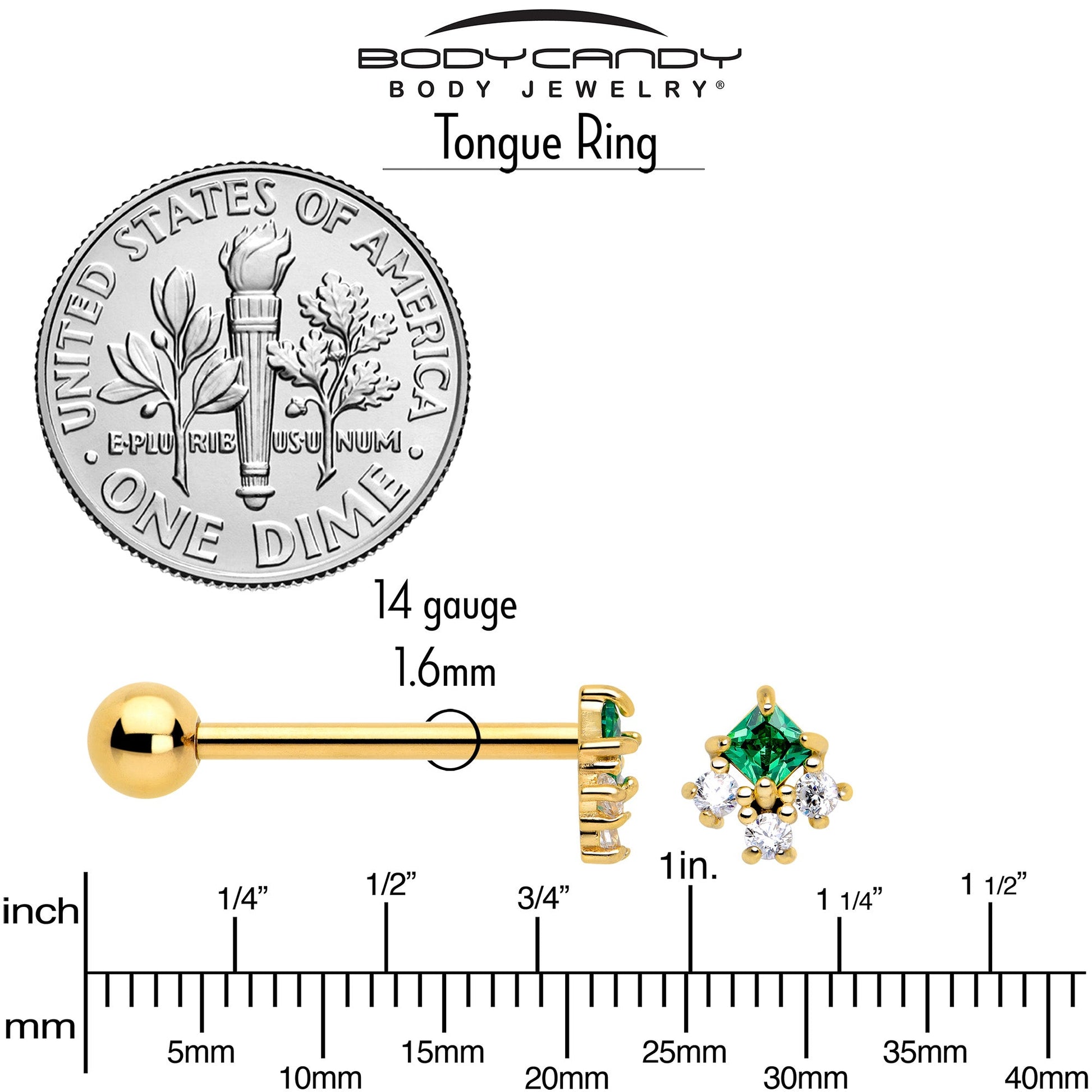 Your look is sure to be a hit when you are rocking this 14 gauge tongue jewelry. It is made with a 5/8 inch gold tone PVD over 316L surgical grade stainless steel straight barbell with a 6mm bottom ball end. The top end features an elegant rhombus charm, with a deep green cubic zirconia gem center and a trio of clear cubic zirconia gem embellishments for a color contrast you can not take your eyes off of. Make an impact with this elegant rhombus tongue piercing ring.