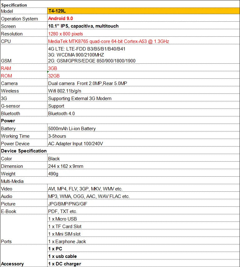 Hot Sales 10.1 INCH T4-129L Tablet PC 3GB RAM 32GB ROM Android 9.0 MTK8765 Quad Core 1280 x 800 pixels WIFI