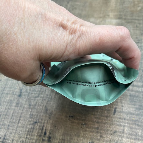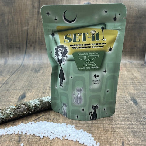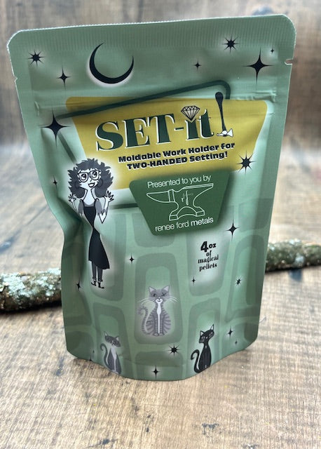 Set-it is a moldable thermoplastic work holder that allows for setting stones with two hands! So many smiths struggle with getting good leverage and stability. This solves your problems! It's easy to use, less sticky than other thermoplastics and gets hard enough for using in the studio across a wide array of uses.