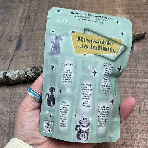 White rice like shaped pellets heat up in hot water and turn clear to form an initial mass that you can form around your piece and hold in a ring clamp, ball vise, swivel vise, or even just your bench pin! It is endlessly adaptable and has so many uses. Tool handles, engraving set ups for anything from flat pieces to complex knife handles, impression molds to use for metal clay and polymer clay and make non-marring jaws for pliers.