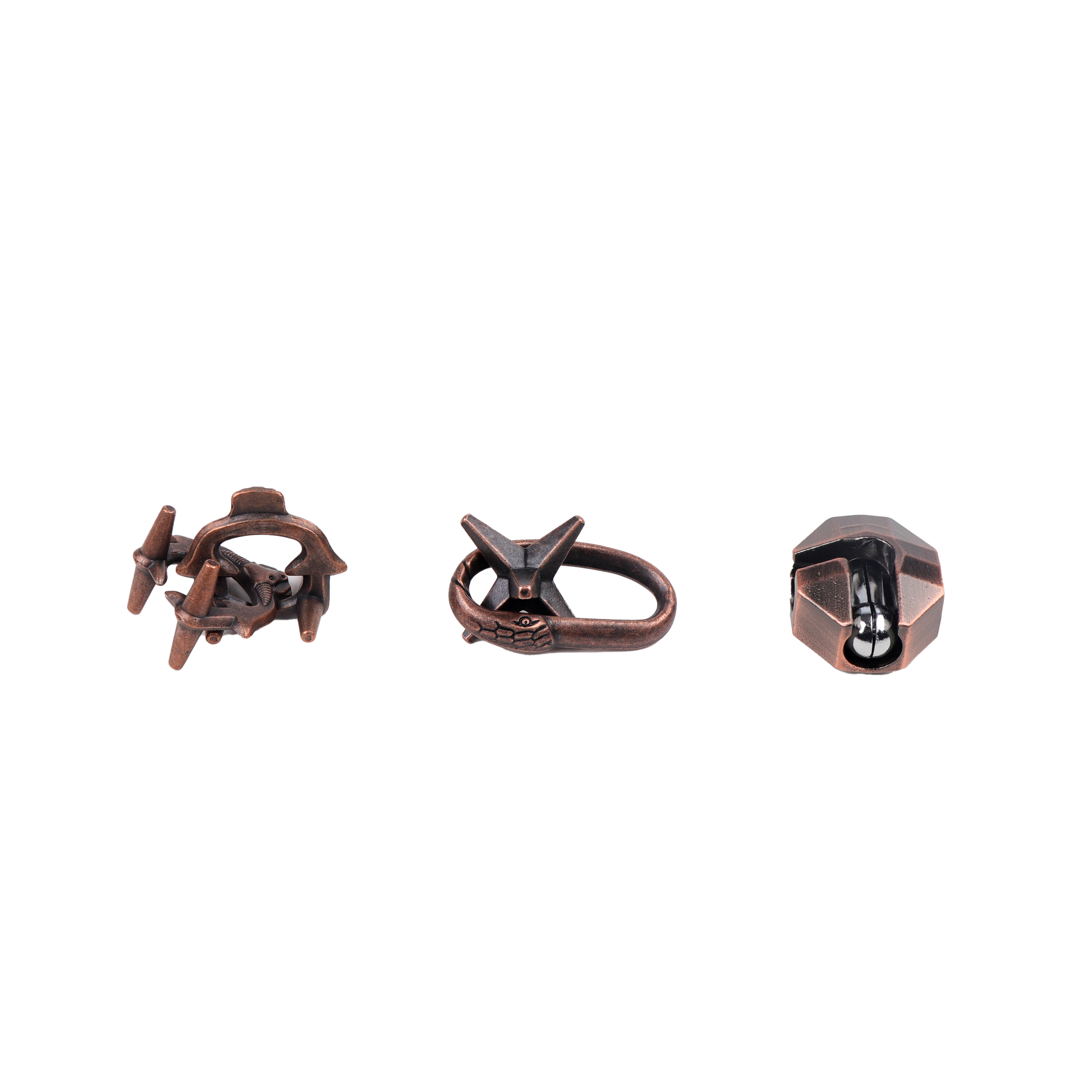 Challenge your wit with three metal puzzles inspired by Viking tools.