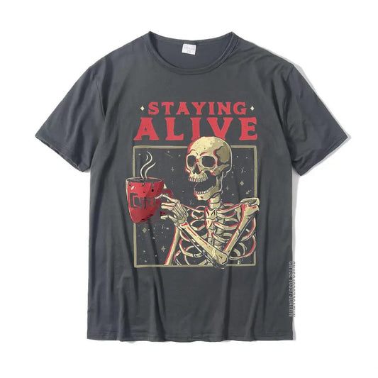 Staying Alive Skeleton Drink Coffee Funny T-Shirt | Unisex Cotton Tee