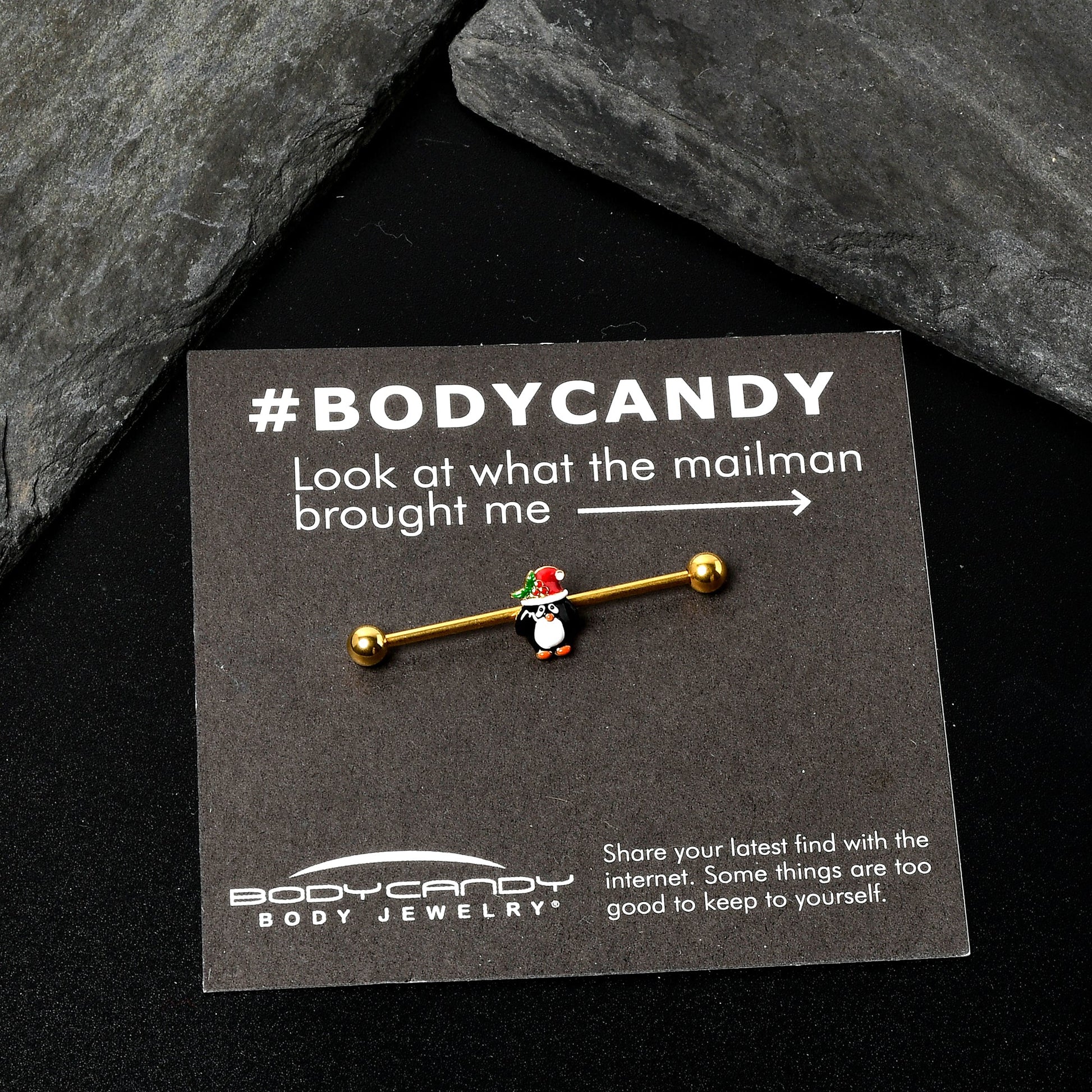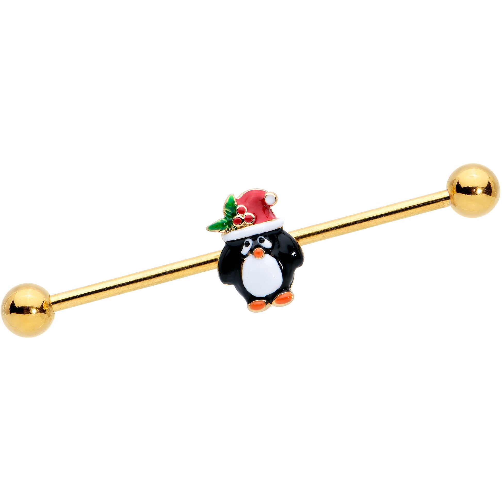 14G Gold Tone Holly Hat Penguin Holiday Industrial Barbell 38mm