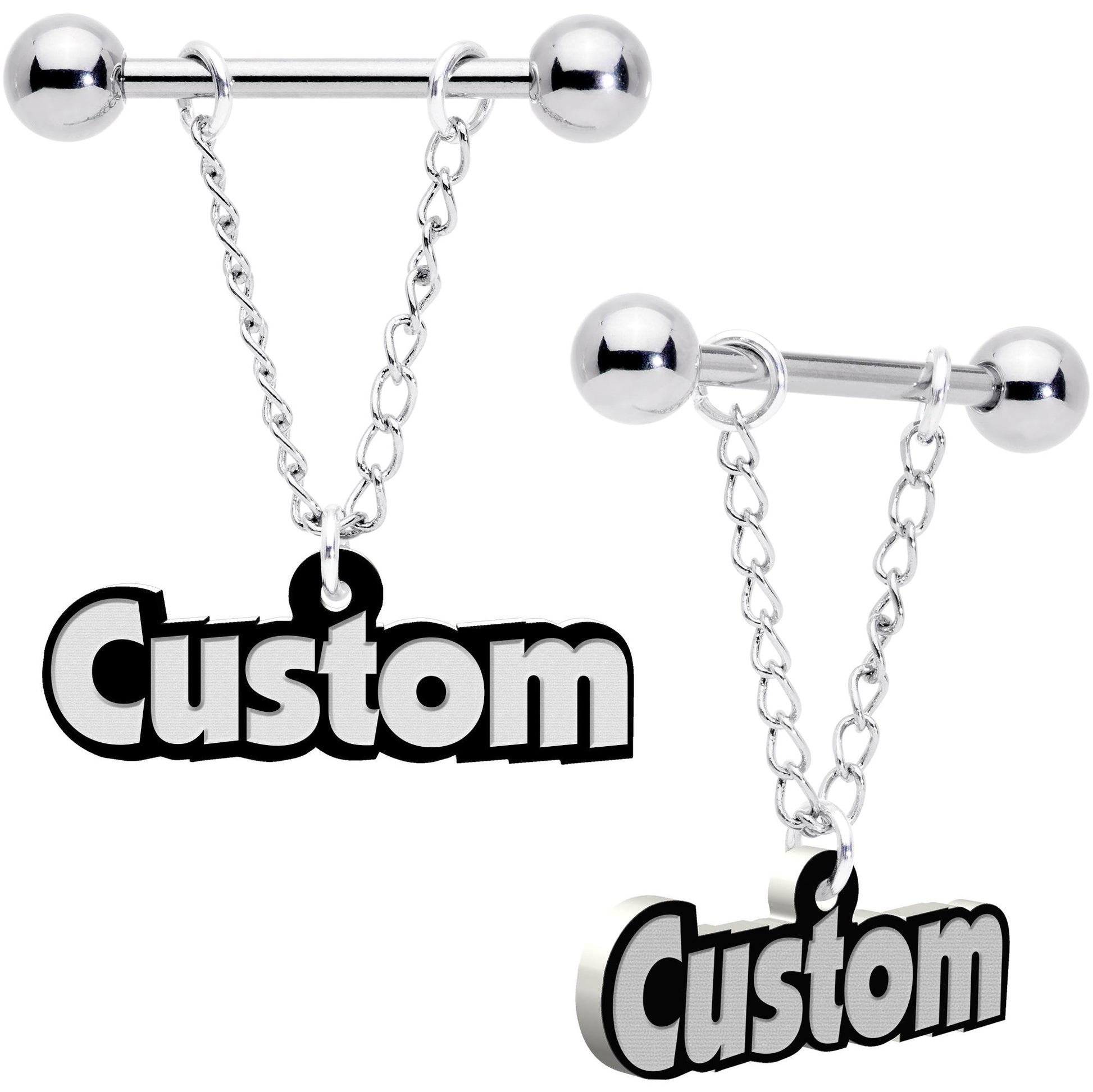 Get creative with your gift giving when you personalize this custom dangle nipple barbell set. This customizable nipple ring set is made with 14 gauge surgical grade stainless steel straight barbell that measures 16mm in length, features glow in the dark charms that can fit your name or personal message up to 7 characters hung from a chain dangle, and is sold as a set of two for you. Simply click and enter the name or short message that means the most to you with this custom nipple jewelry that is a unique gift idea for someone special.