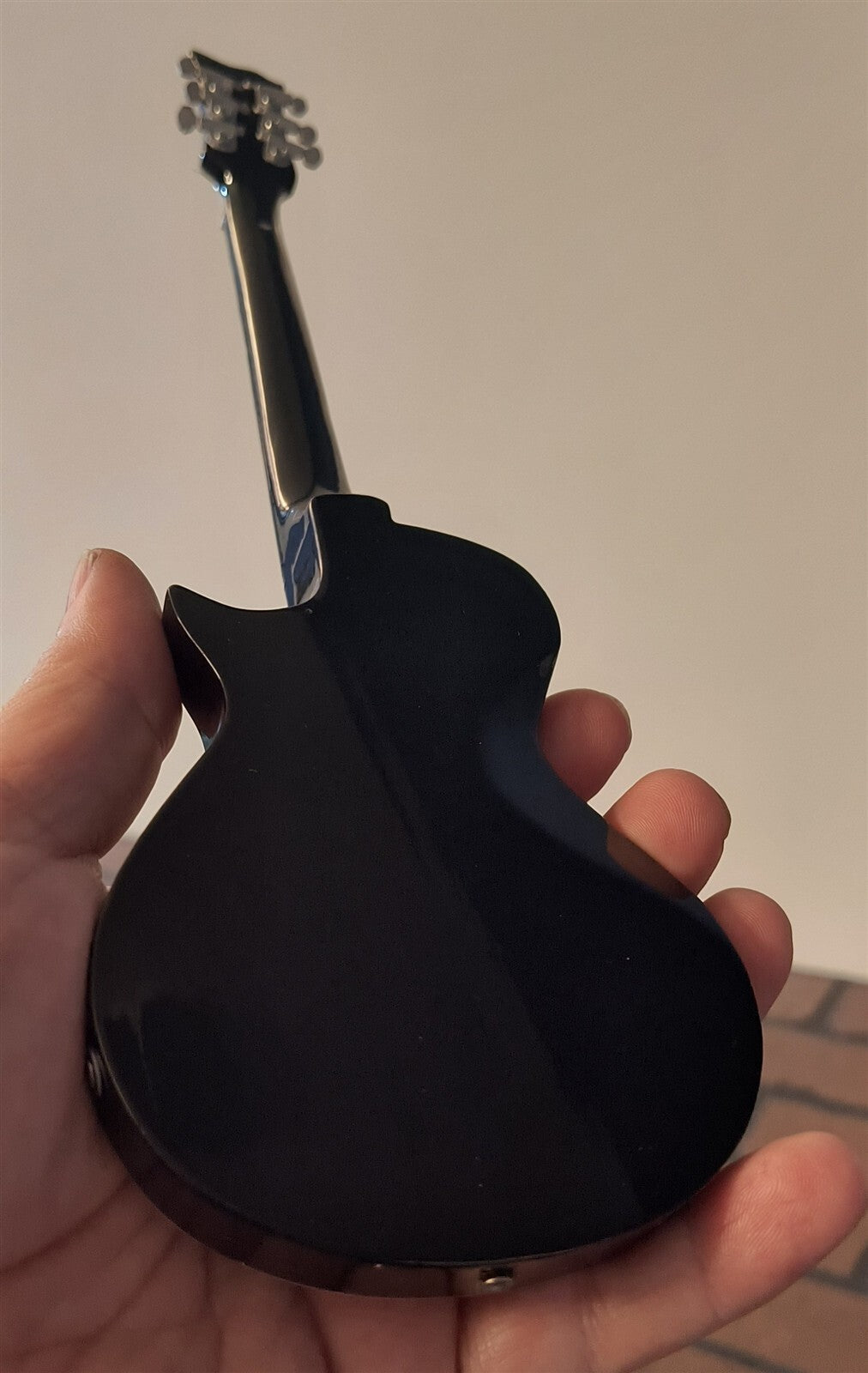 This miniature 1:4 scale replica model instrument can fit in the palm of your hand. It is approximately 10.5 inches in length and comes with an adjustable display stand and is packaged in a guitar gift box. Each guitar is individually handcrafted from solid woods, plastics, resins, etc. (depending on the guitar style) with metal tuning keys. Check out our listings for guitar hard cases and miniature amplifiers to complete your guitar set-up.