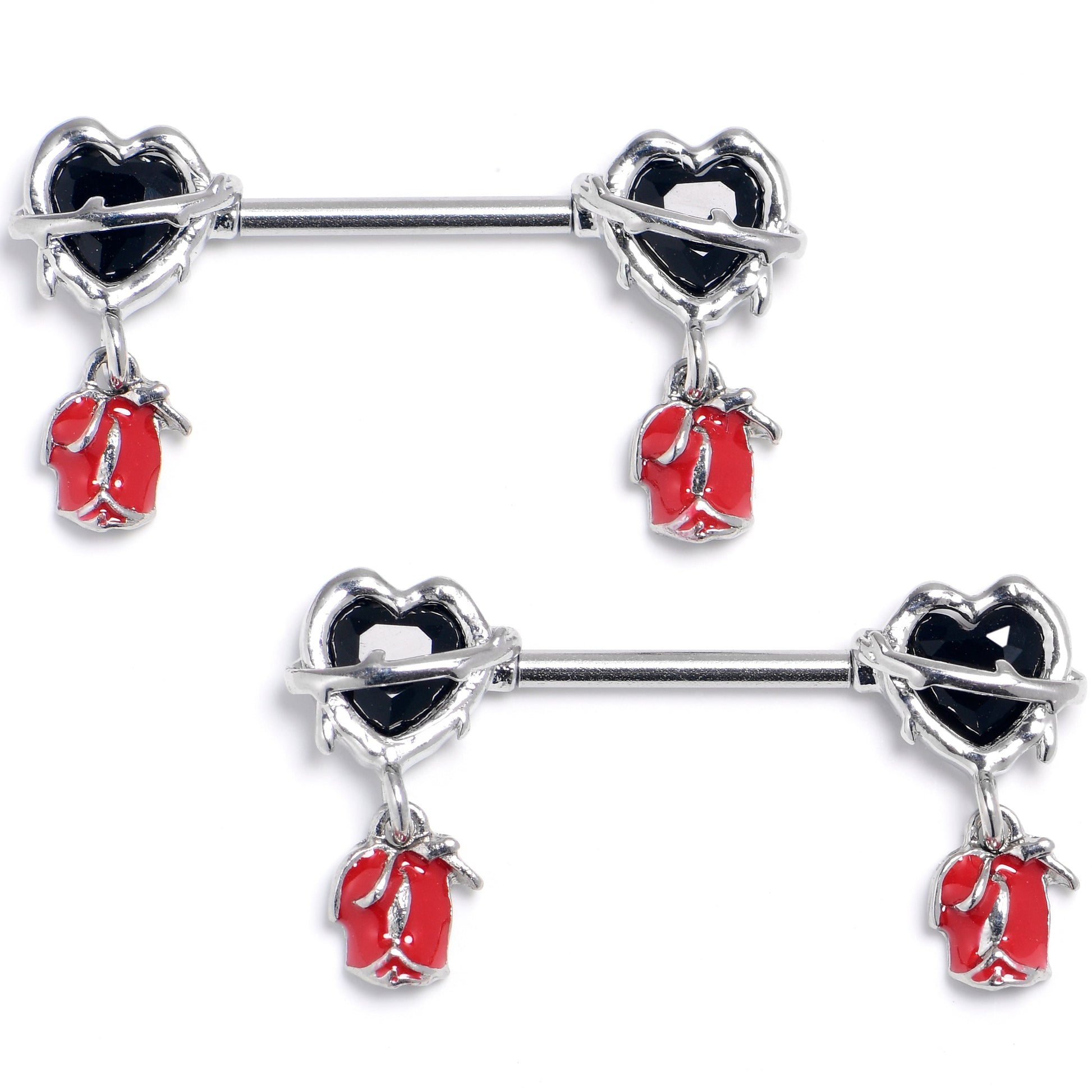 Keep your heart wrapped tight or this 14 gauge nipple jewelry will steal it. It is made with 14mm durable 316L surgical grade stainless steel straight barbells. Each of the ends features a black heart charm, with barbed wire detailing. Dangling beneath each one is a rose charm, with deep red petals. Even the blackest of hearts will melt for these gorgeous nipple piercing rings. Sold as a set of two.Specifications
