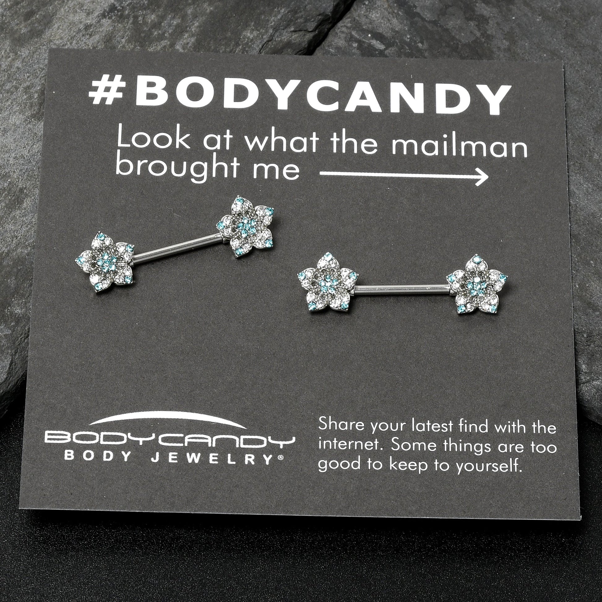 14G 9/16 Blue Clear Gem Opulent Flowers Barbell Nipple Ring Set