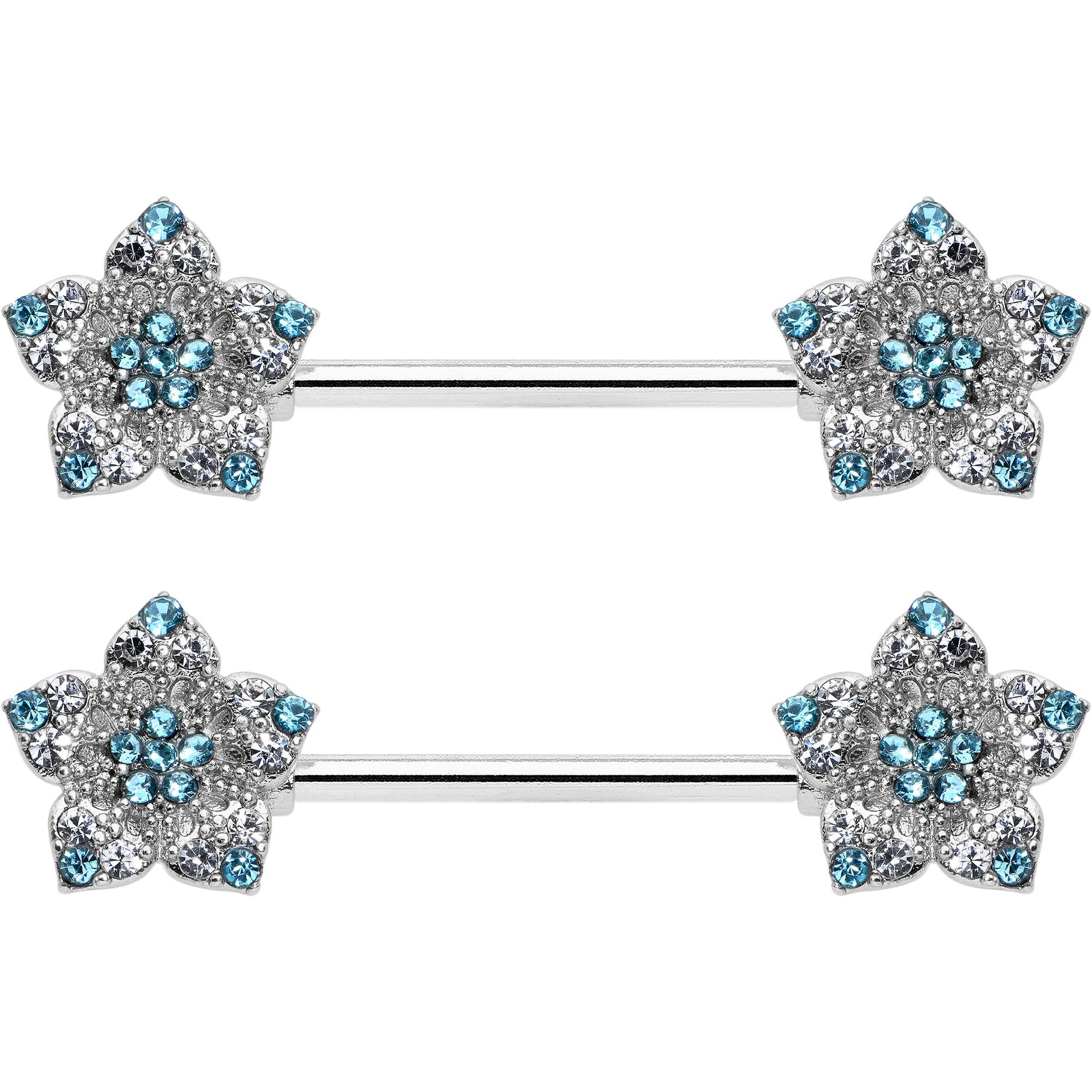 14 Gauge 9/16 Blue Clear Gem Opulent Flowers Barbell Nipple Ring Set