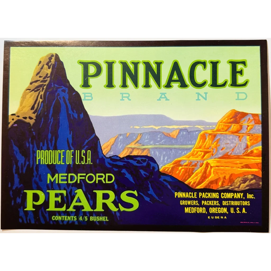 Step back in time with this extraordinary Antique Vintage 1940s Pinnacle Medford Pears Crate Label! Crafted by the renowned Pinnacle Packing Company, Inc. in Medford, Oregon, this gem is a window into America's rich agricultural history.