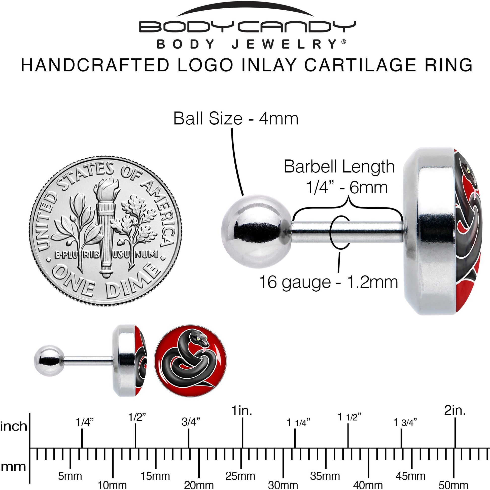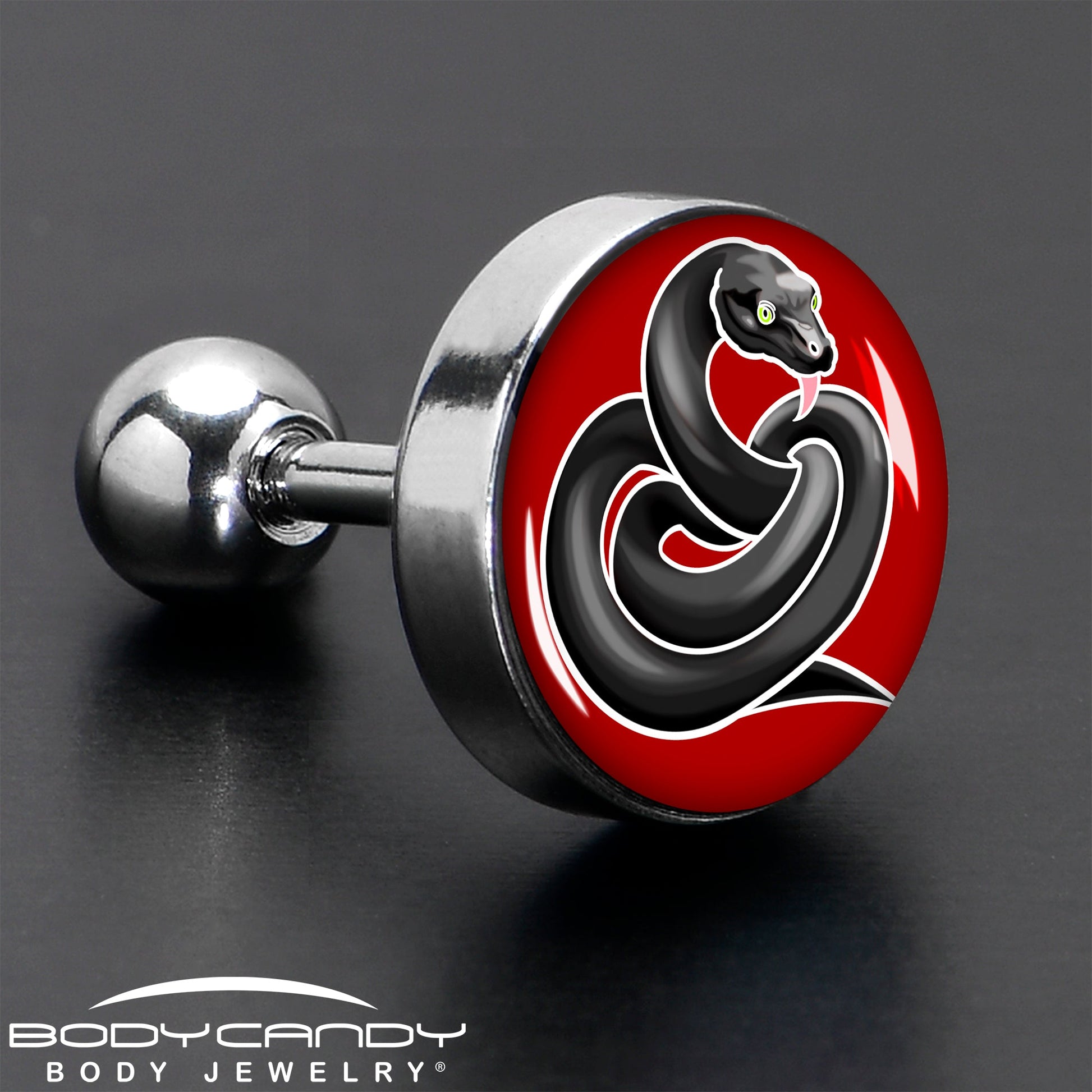 Add some slithery, scaly style to your look with this elegantly styled 16 gauge tragus stud. It is made with a 6mm durable 316L surgical grade stainless steel straight barbell with a 4mm ball end. It features a red disc with a black snake on it. The snake is coiled up, with its head raised as if to strike and you can rock it in multiple piercings including tragus, helix, and some conch piercings. If your look is ripe for some reptilian additions, this cartilage piercing ring totally fit the bill.