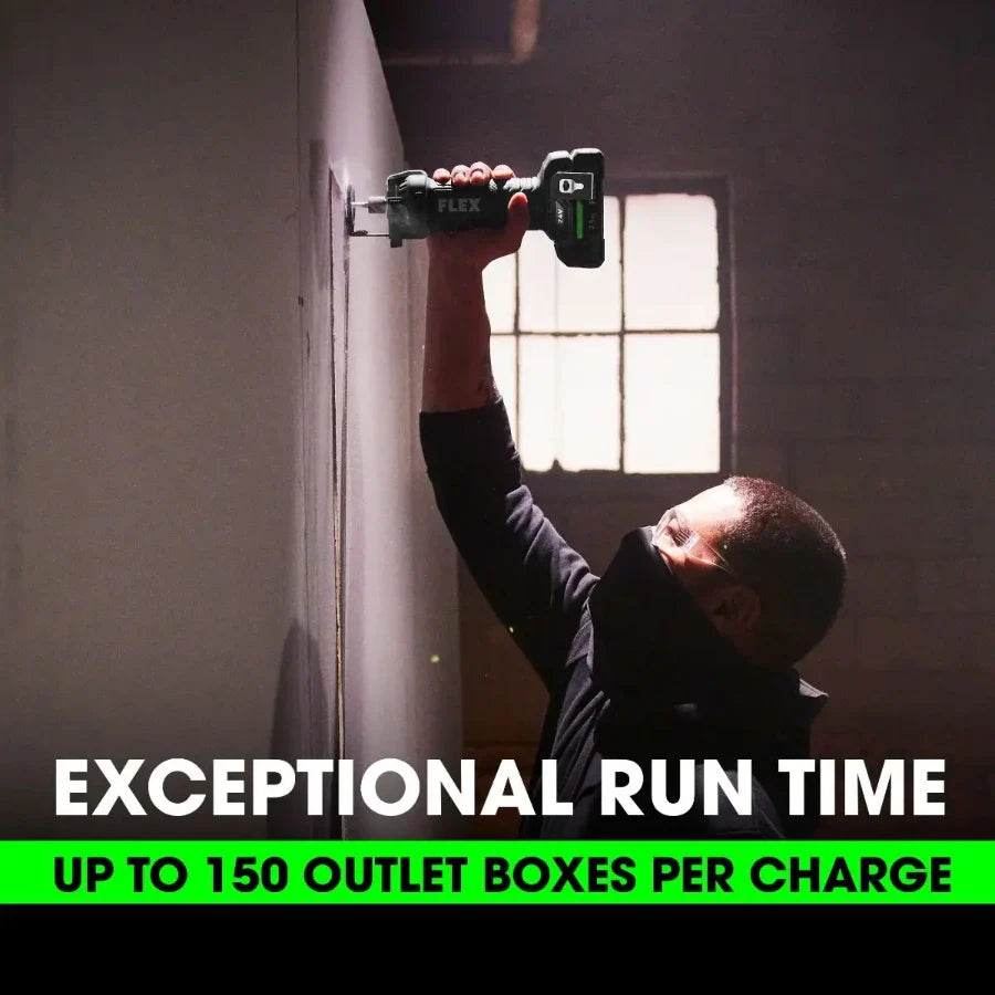 The FLEX 24V Drywall Cut Out Tool powers through the entire day with exceptional runtime—up to 150 outlet boxes per charge with the included 2.5Ah battery. Adjustable airflow directs the dust away from the work in the direction desired. Built-in LED lighting illuminates in dark conditions. This cut out tool also delivers the FLEX Advantage of unmatched FLEX 24V battery power, runtime, and fast charging to keep you going. The drywall cut out tool kit includes the drywall cut out tool, (2) 2.5Ah lithium batteries, and a 160W Fast Charger. It’s all protected by the FLEX Limited Lifetime Warranty when registered within 30 days of purchase at registermyFLEX.com through December 31, 2024.