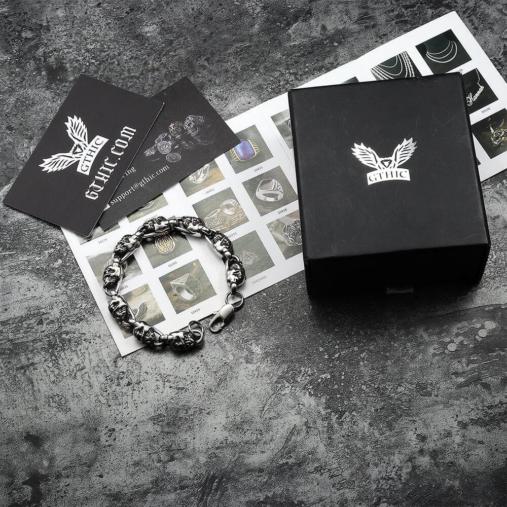 This bracelet is made of stainless steel with the theme pattern of the skull that creates a look that is both dark and rugged, making it great for any punk skull fans. Men's stainless steel bracelet, skull bracelet. It is a comfortable yet masculine bracelet, one that you will not be disappointed with. Get yours today!
