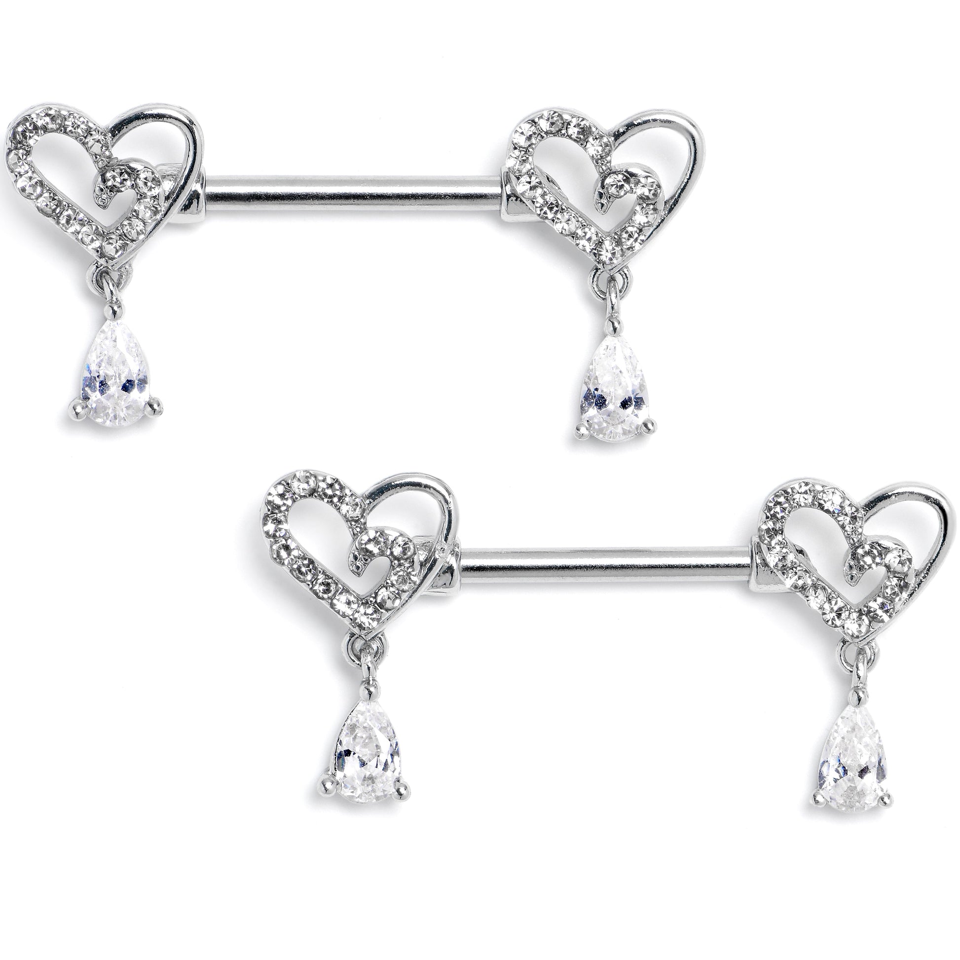Keep style on your side when you fall in love with this 14 gauge nipple jewelry. It is made with 14mm durable 316L surgical grade stainless steel straight barbells. Each of the ends features a heart charm, with one side paved with clear cubic zirconia gems while the other side is unadorned for simple, asymmetrical style, and there is a clear cubic zirconia gem dangle for added motion. Get ready to love these opulent nipple piercing rings. Sold as a set of two.Specifications