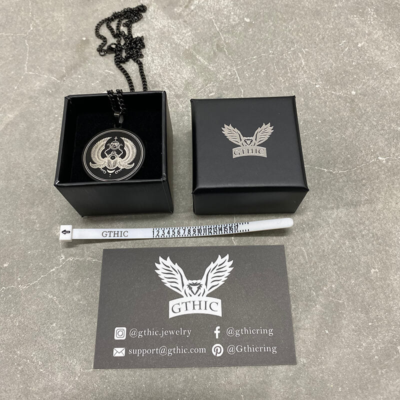 This is a mysterious necklace with the ancient Egyptian symbols Eye of Horus and scarabs. The Scarab, a good luck beetle, represents the journey of the sun across the sky, and it was one of the most sacred amulets in ancient Egypt. The Eye of Horus was used as a sign of prosperity and protection, derived from the myth of Isis and Osiris.
