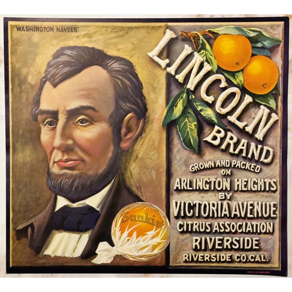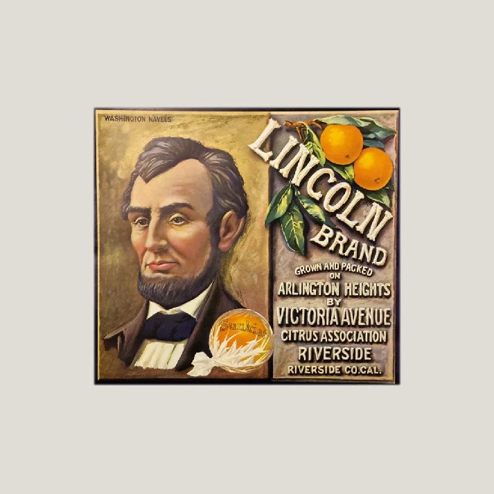 But hold on to your hats, folks! This isn't just any old label – it's a mesmerizing portal to a bygone era. Feast your eyes on the stoic visage of President Abraham Lincoln, captured in breathtaking detail. The Victoria Avenue Citrus Association, known for their top-notch produce, only ever sold two brands: Lincoln and Victoria. Talk about exclusivity!