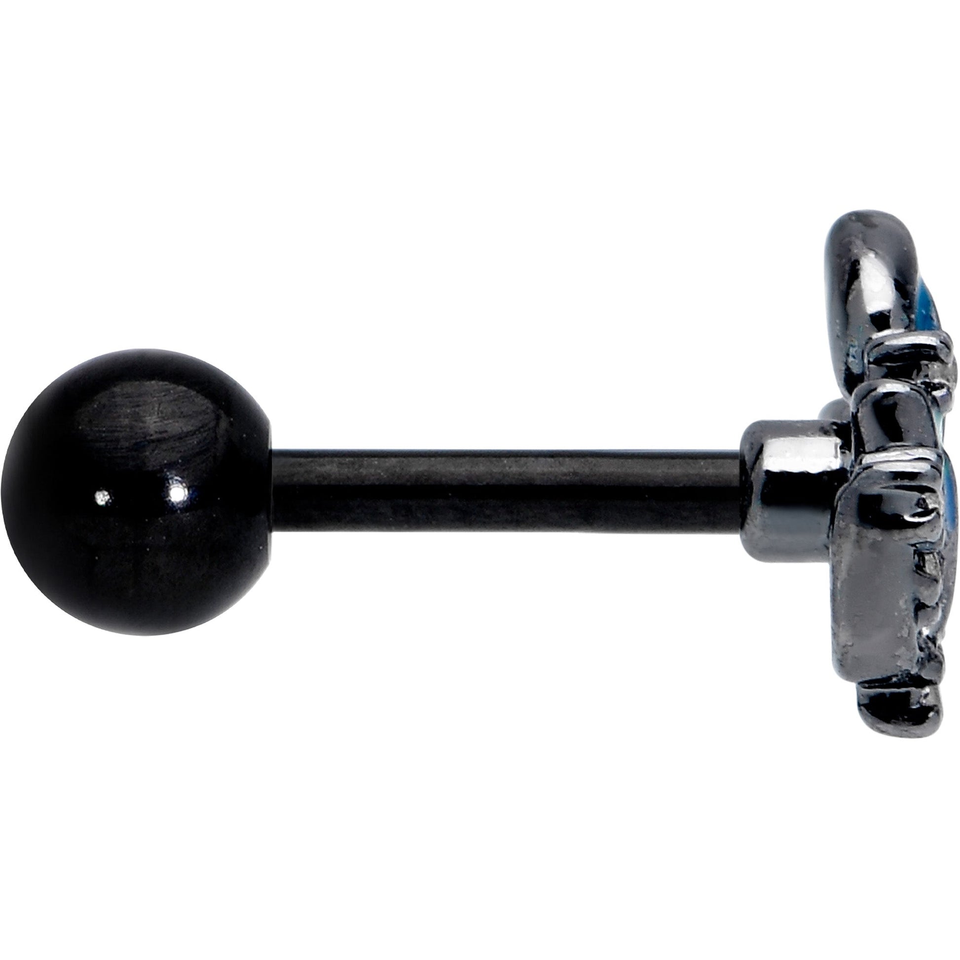 Get a lush, tropical look with this leafy 16 gauge tragus stud. It's made with a 6mm black PVD over 316L surgical grade stainless steel straight barbell with a 4mm ball end. It features a a green and blue leaves charm, embellished with clear cubic zirconia gems. You can even rock it in multiple piercings including tragus, helix, and some conch piercings. You'll be looking luscious and lovely when you are rocking this tropically styled cartilage piercing ring.