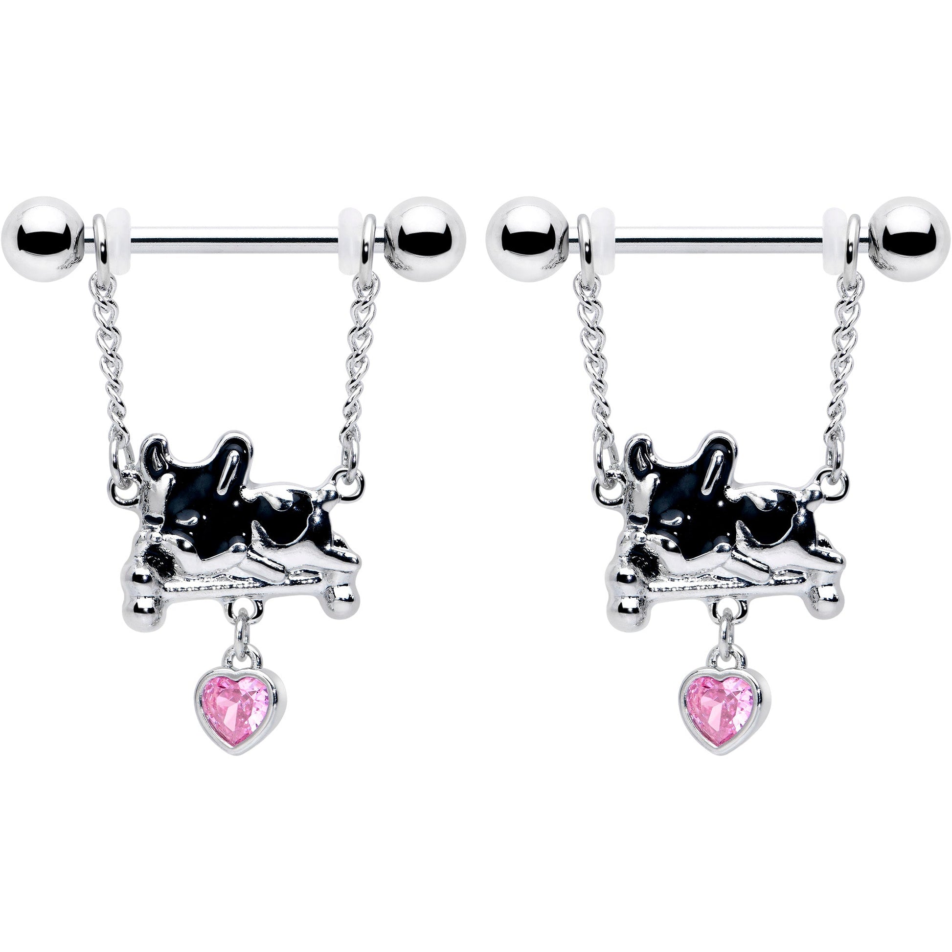 Get comfy and cozy while looking as cute as the dogs on this 14 gauge nipple jewelry. It's made with 14mm durable 316L surgical grade stainless steel straight barbells with 5mm ball ends. Each barbell features a double length of matching chain. Dangling from each pair of chains is a charm of a French Bulldog with graphic black and white colors, snoozing on a bed. Dangling beneath them are pink gem hearts so everyone knows how much you love these popular puppers. You'll be ready to sit and beg for these adorable French Bulldog nipple piercing rings. Sold as a set of two.