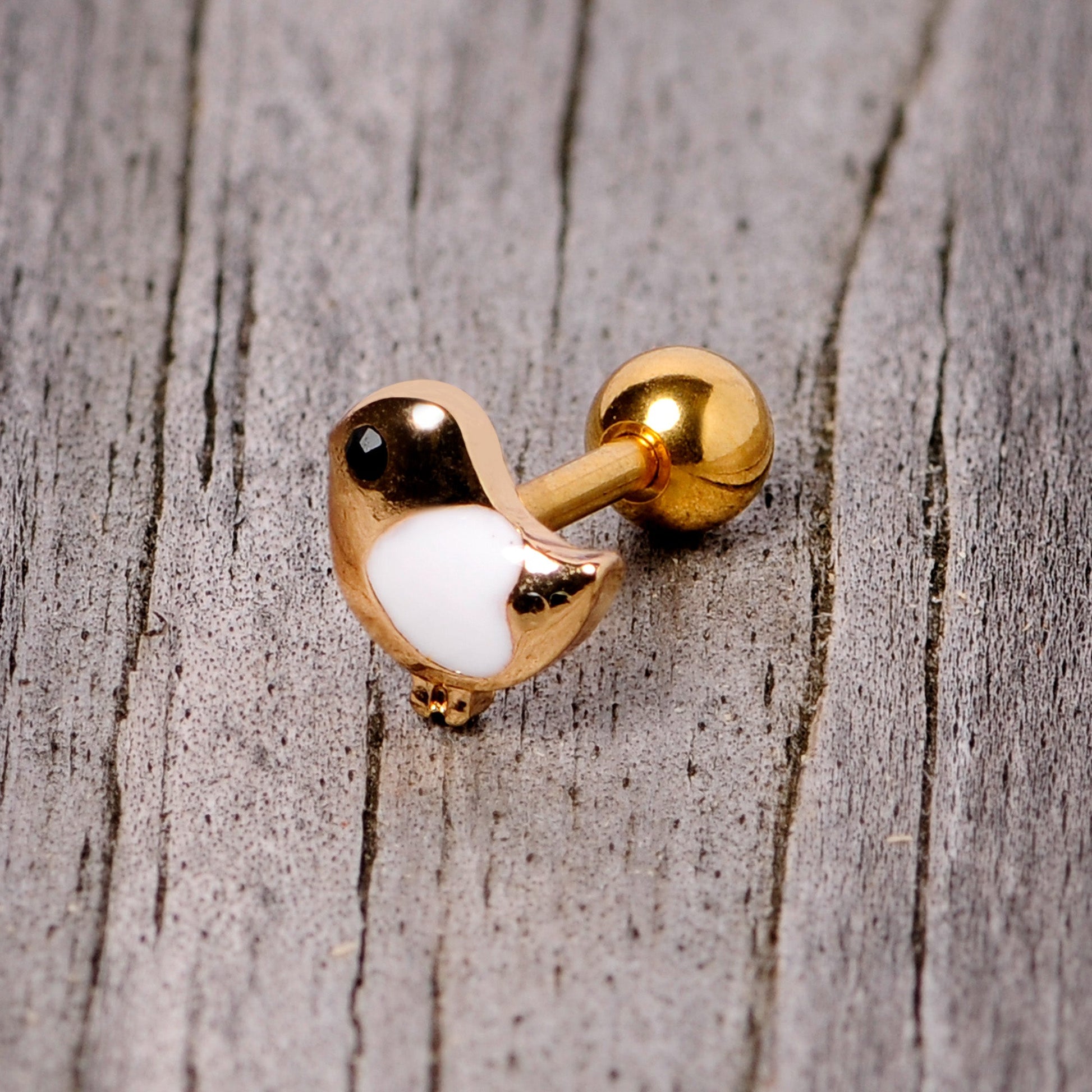 Oooooh, baby....bird! This 16 gauge chick is happy to nest in your cartilage piercings and look lovely doing it! It's made with a 6mm gold tone PVD over 316L surgical grade stainless steel straight barbell with a 4mm ball end and features a small baby chick charm with a black gem eye and white wing. This little bird tragus jewelry can roost in multiple cartilage piercings as well, including the tragus, helix, and some conch piercings! Now that is definitely one hot chick!
