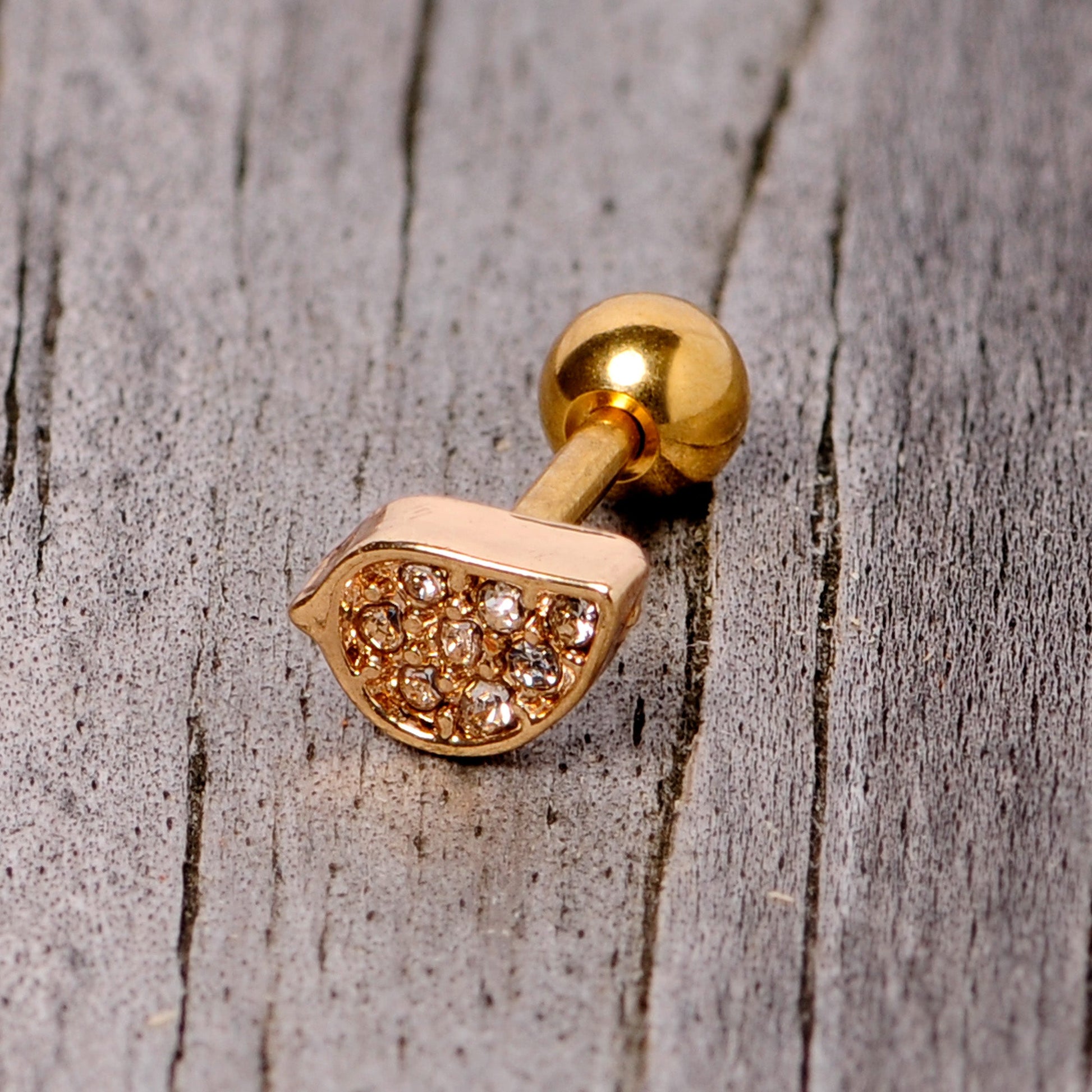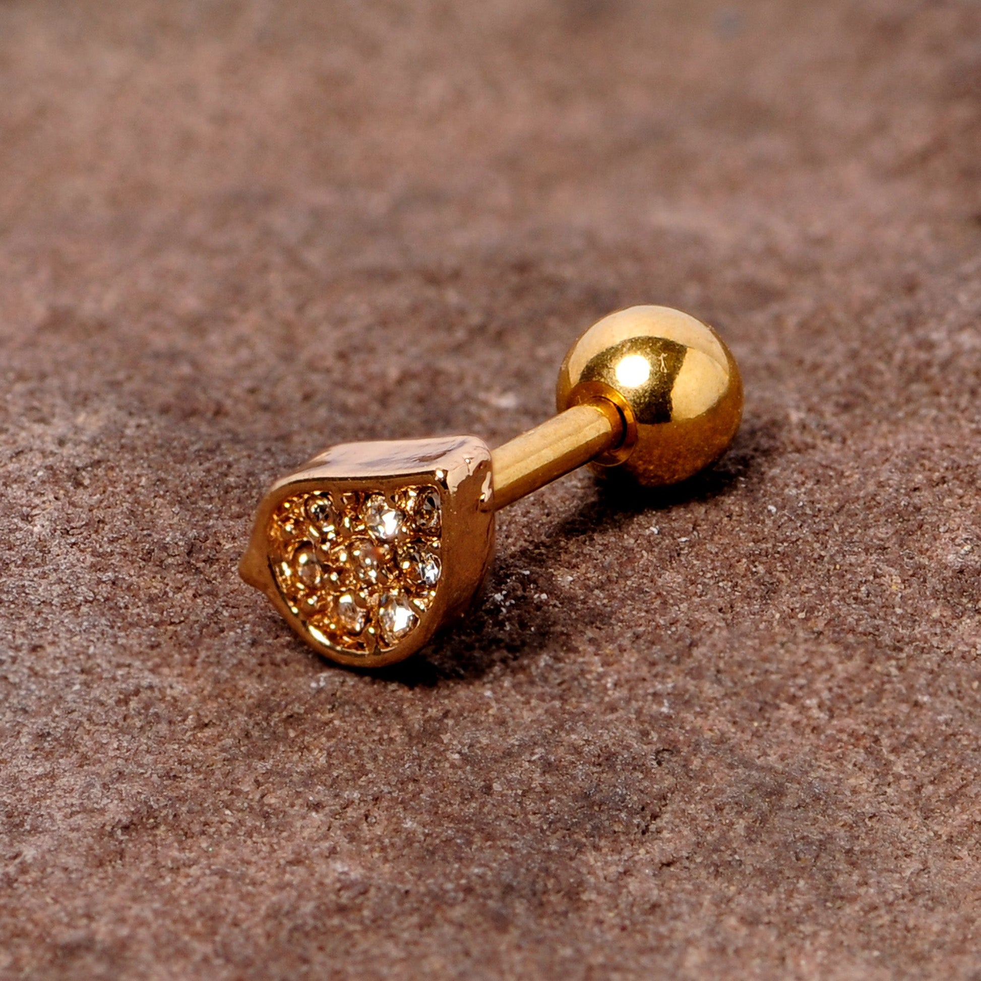 This 16 gauge stylish swirl will add abstract style to any piercing it graces! It's made with a 6mm gold tone PVD over 316L surgical grade stainless steel straight barbell with a 4mm ball end. It features a curved design charm paved with clear gems for a look of geometric glamour. It's sure to add a touch of refined elegance to your look and works well in multiple cartilage piercings including the helix, tragus, and some conch piercings. Beautiful and multi-purpose.....it's enough to make your head swirl!