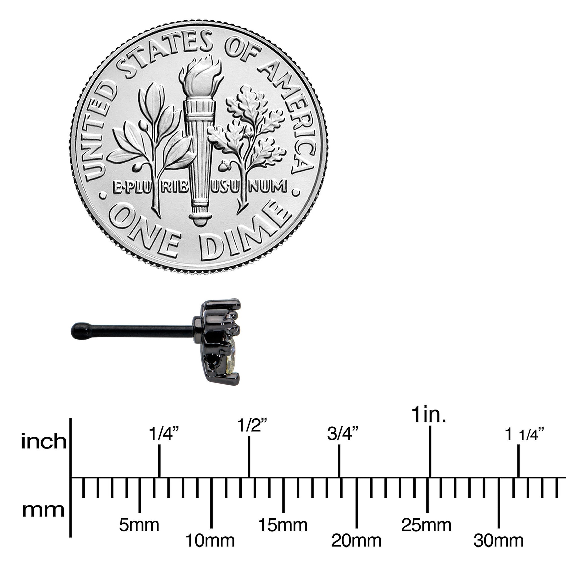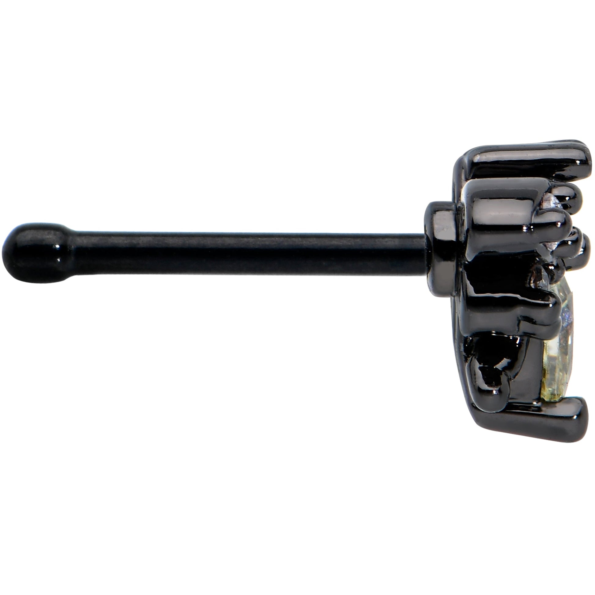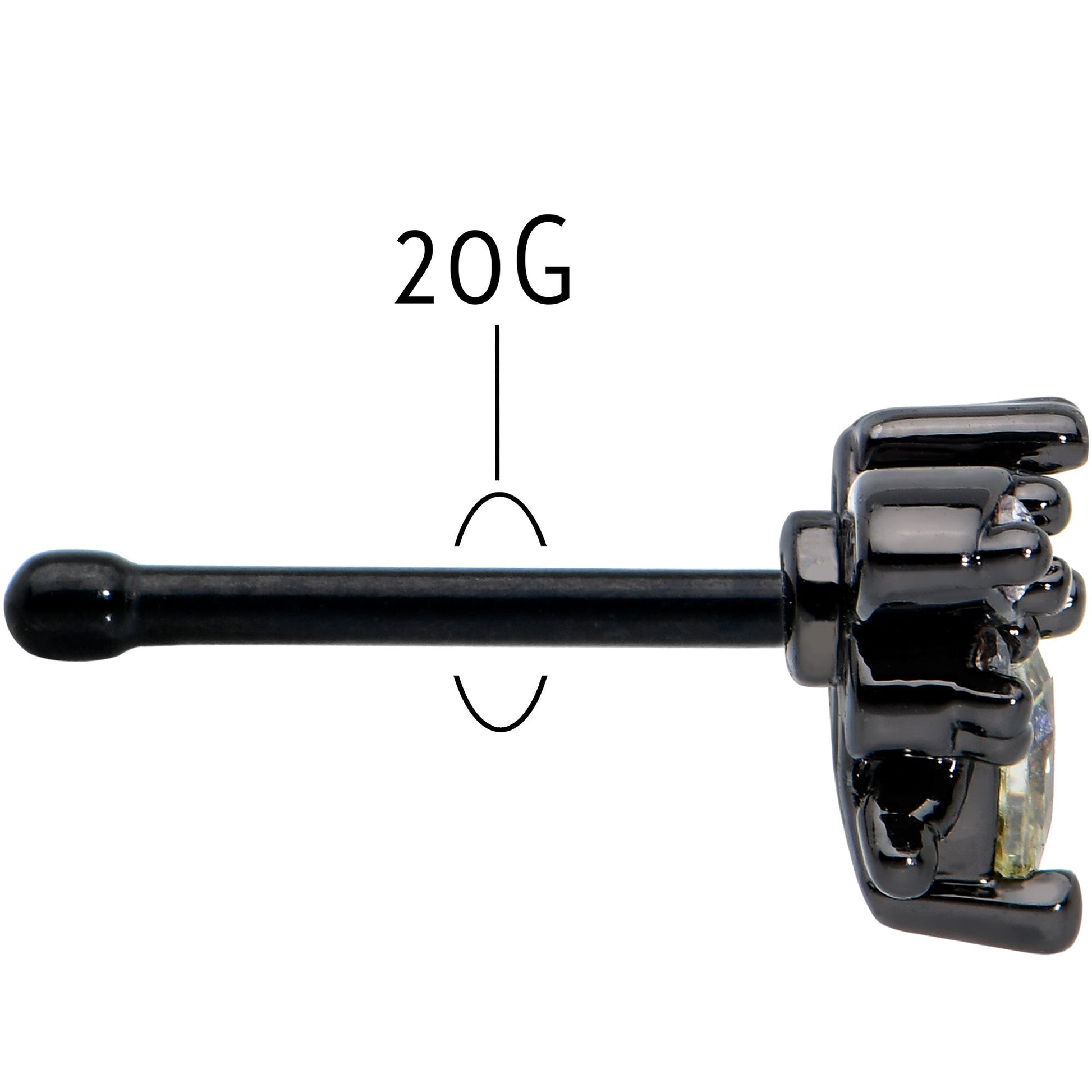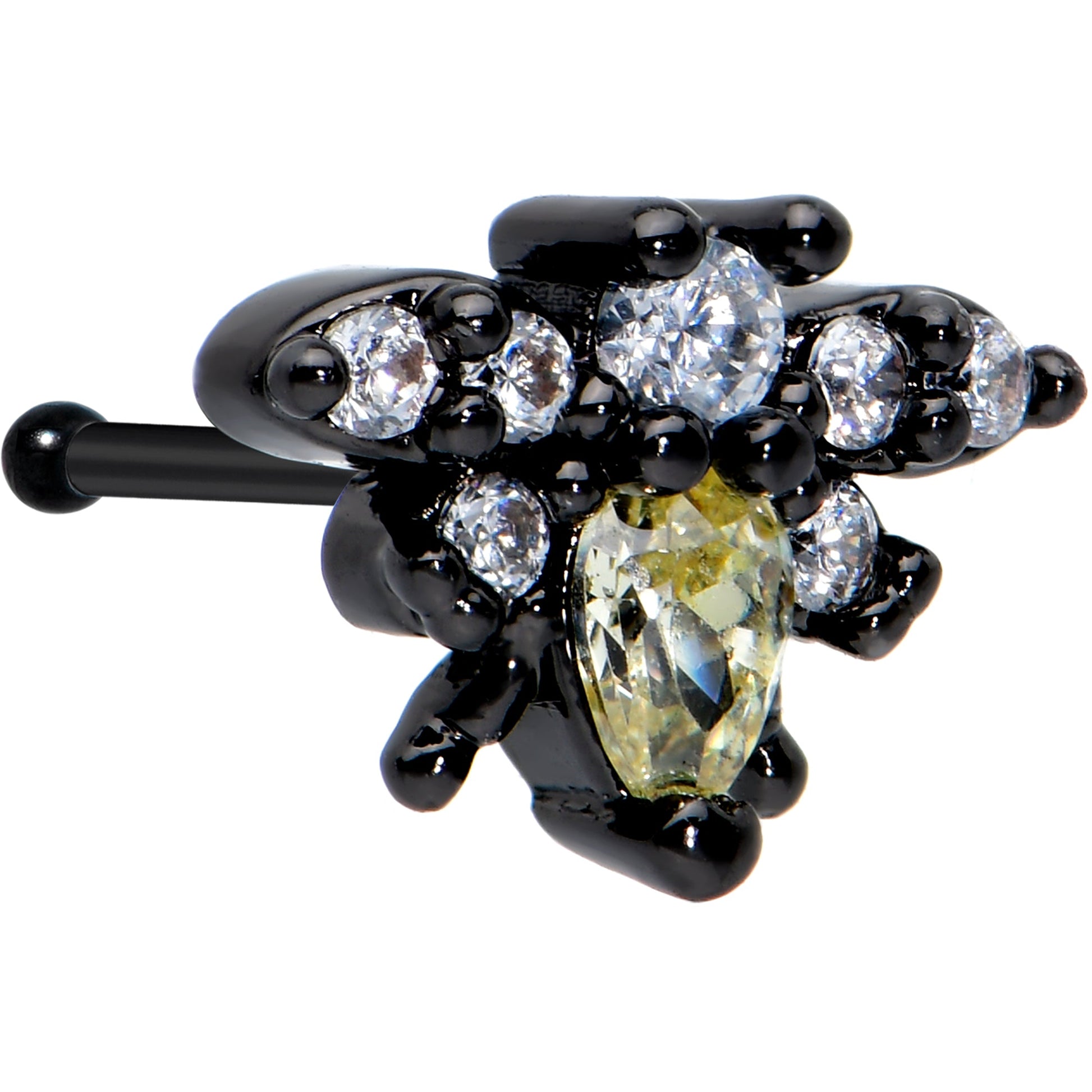 Give your heart a flutter with this 20 gauge butterfly nostril ring! It's made with a 6mm black PVD over 316L surgical grade stainless steel straight post. It features a butterfly charm. The butterfly has a yellow gem body and a clear gem head, while its wings are black and set with matching clear gems. You'll be ready to bloom with this beautiful butterfly nose piercing jewelry!Specifications