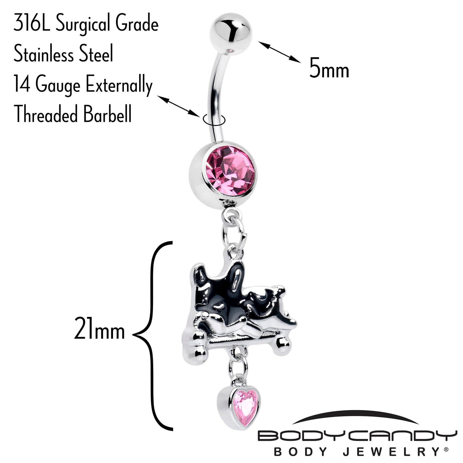 Get comfy and cozy while looking as cute as the dog on this 14 gauge navel ring. It's made with a 3/8 inch 316L surgical grade stainless steel curved barbell with a 5mm top ball end. The bottom ball end is 8mm and set with a large pink gem. Dangling beneath is a charm of a French Bulldog with graphic black and white colors, snoozing on a bed. Dangling beneath it is a pink gem heart so everyone knows how much you love these popular puppers. You'll be ready to sit and beg for this adorable French Bulldog belly piercing jewelry.