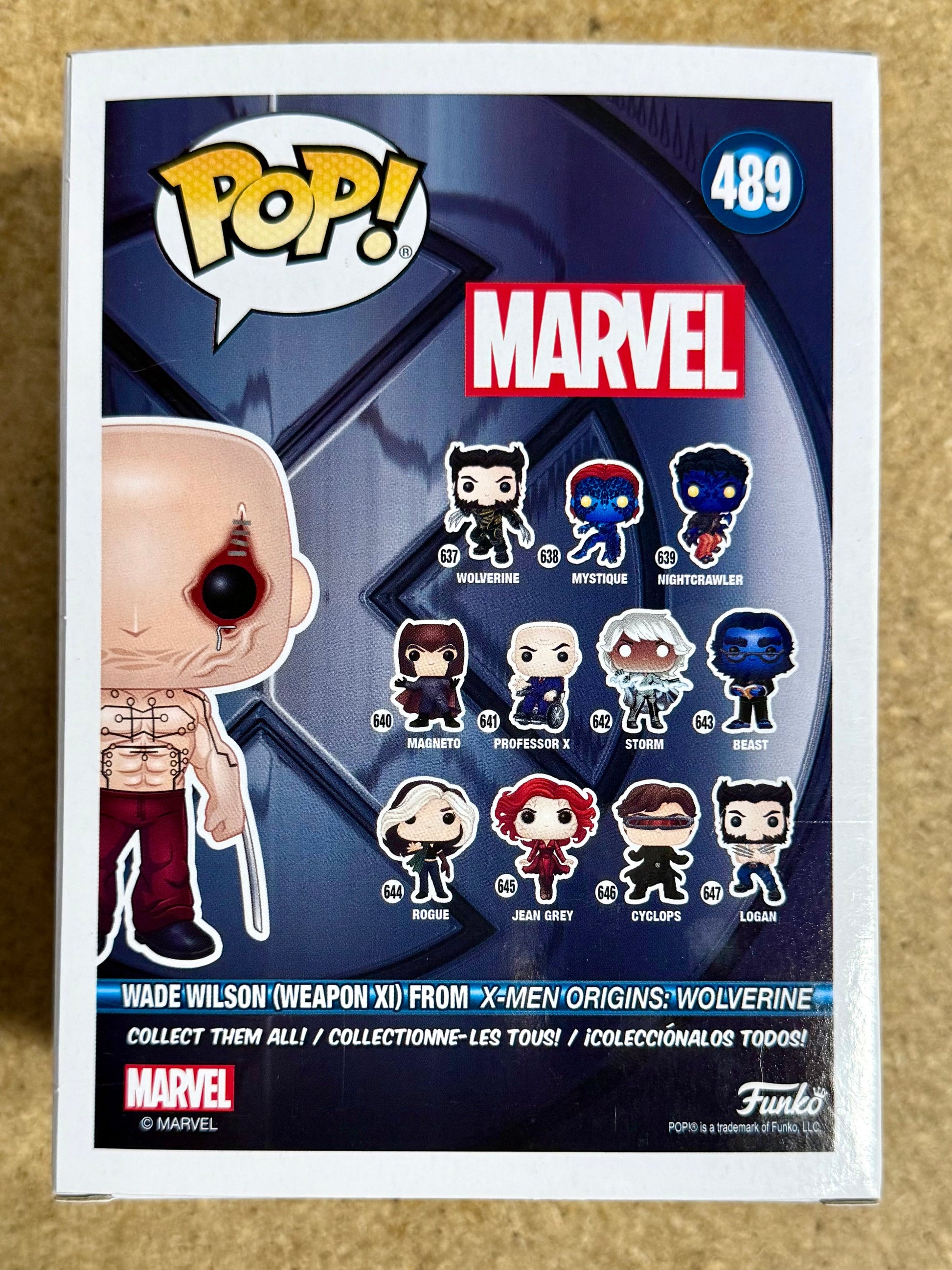 The product is a signed TJ Miller Wade Wilson (Weapon XI) Funko Pop #489 from the Marvel Universe. This vinyl figure features the character of Deadpool and comes with a JSA COA for autograph authentication. TJ Miller Played Weasel in the Deadpool movies 1 & 2.
