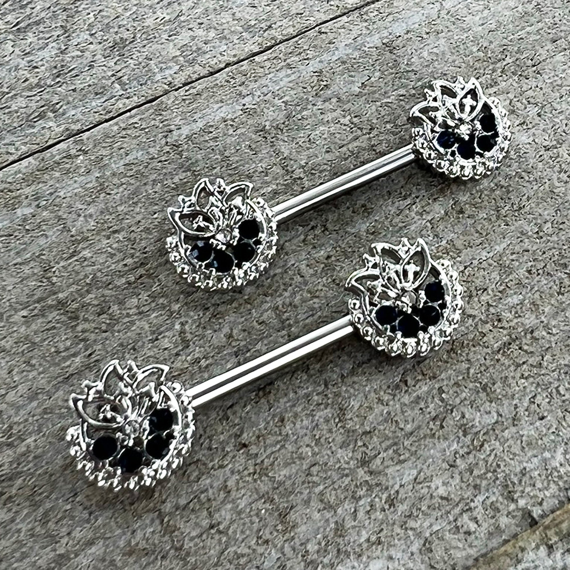 The curves on this 14 gauge nipple jewelry are sure to catch eyes! It's made with 12mm durable 316L surgical grade stainless steel straight barbells. Each of the ends features an abstract arch charm, with the outermost rims set with textured embellishment and the inner curves set with deep blue gems. Below those are abstract flower designs with clear gem centers. Get abstract with these elegant nipple piercing rings! Sold as a set of two.