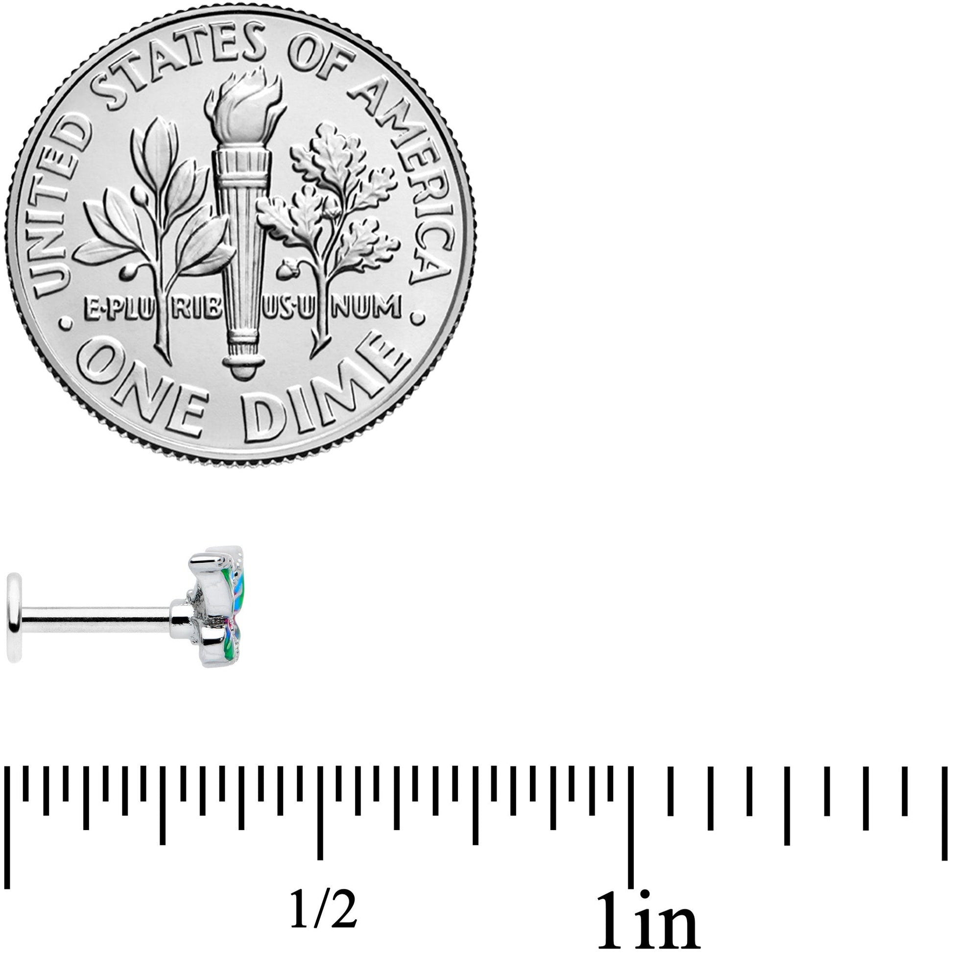 This 16 gauge tragus ring is one you can't help but notice! It's made with a 6mm durable 316L surgical grade stainless steel straight barbell with a flat disc end. It features a butterfly charm, inlaid in bright shades of pink, blue, and green. The butterfly is further embellished with textured detailing for an added touch of glamour. You can even boast this beauty in multiple piercings including tragus, helix, and some conch piercings! Let your look spread its wings and soar into style with this bright and beautiful butterfly cartilage piercing ring!