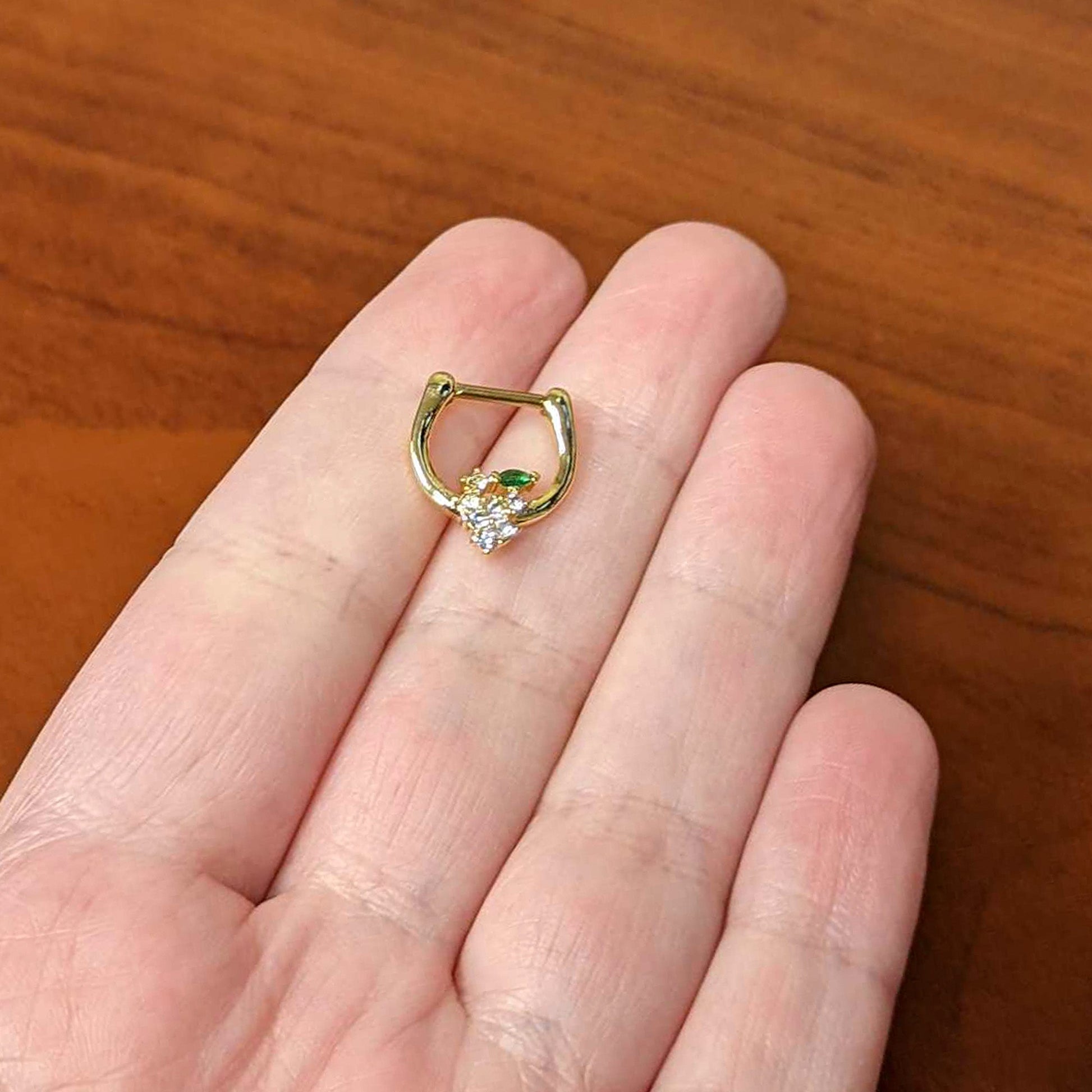 The delicious fruit on this 16 gauge tragus ring is one bunch you can't resist! It's made with an 8mm gold tone PVD over 316L surgical grade stainless steel hinged straight barbell. It features a grapes charm, with purple gems and clear gems for fruit. The leaf is composed of a single green gem for a striking color contrast. It also features a hinged, clicker design that makes insertion and removal a snap and you can rock it in multiple piercings including tragus, helix, and some conch piercings. You'll be all set to wine and dine when you're rocking this gorgeous grape fruit cartilage piercing jewelry.