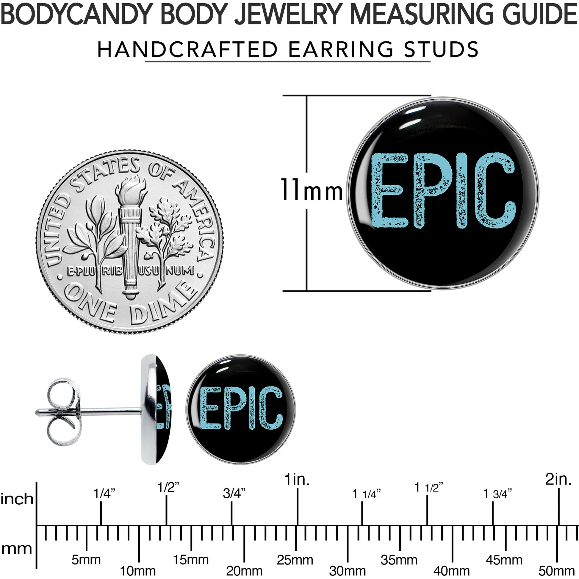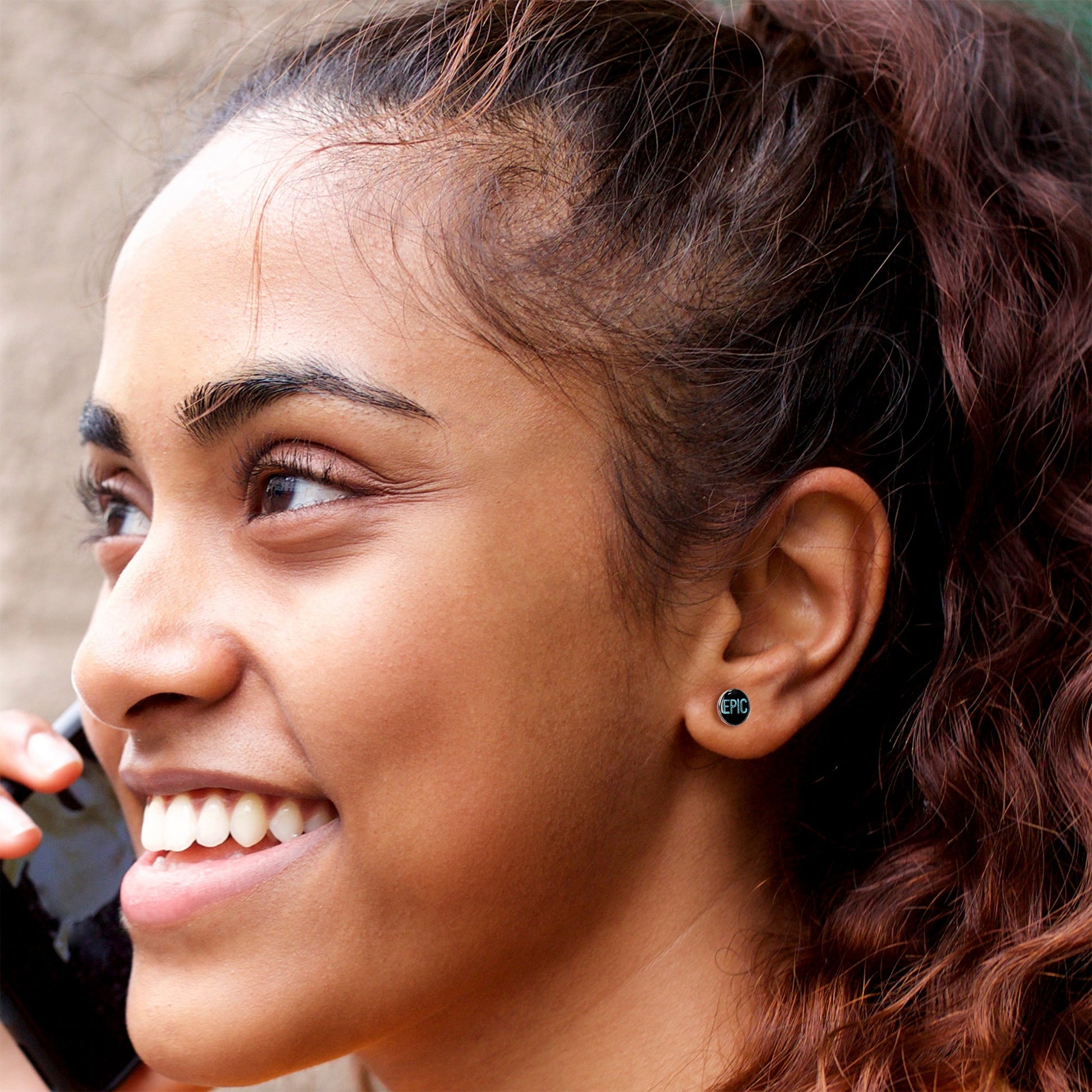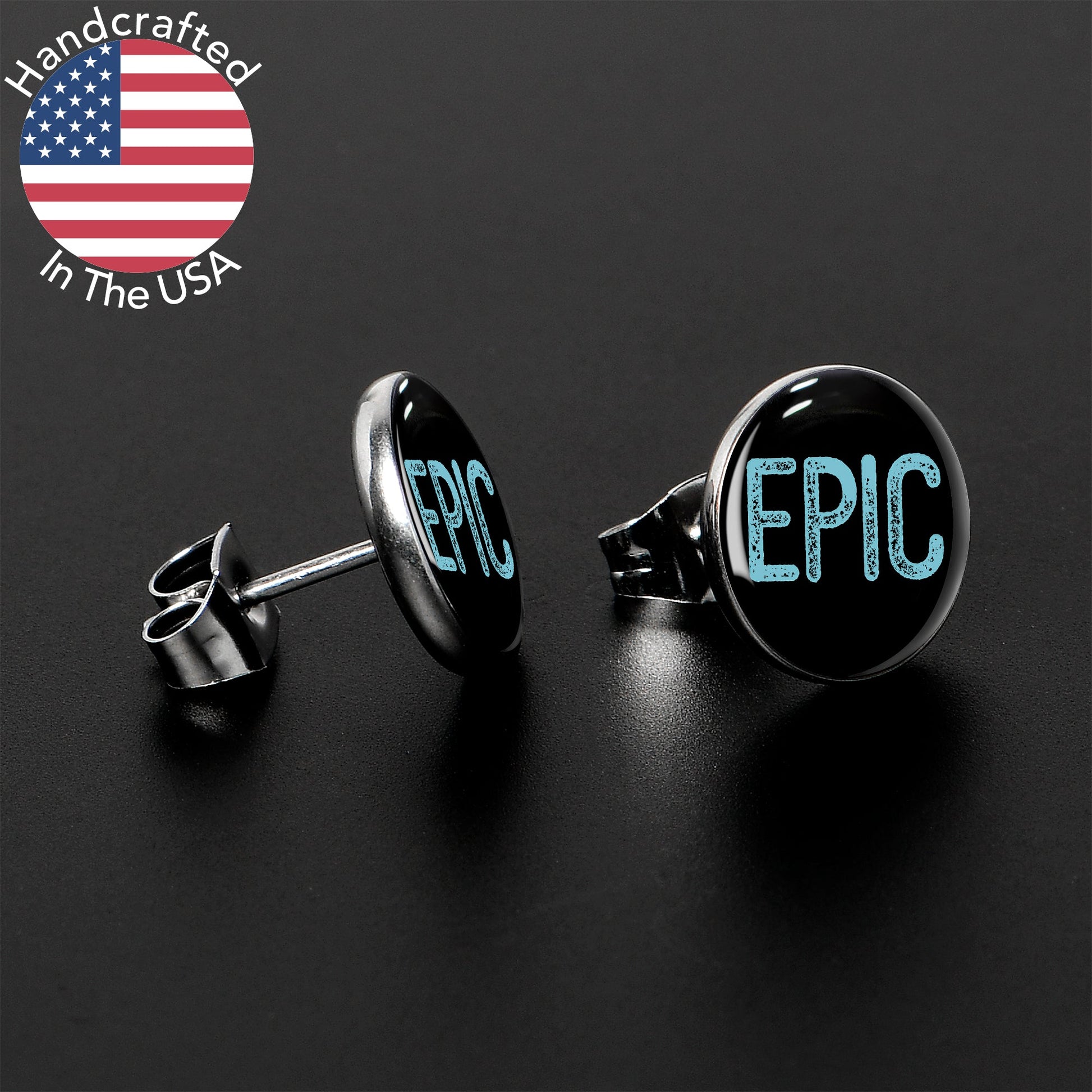 Some things are better than great, they are truly epic - as seen on these earrings for pierced lobes. They are made with stainless steel straight posts with friction backs for a secure fit. The front end each features a black, disc shaped charm. They feature the word epic, in blue, all capital letters. If you are brimming over with love about something truly amazing, spread the word with these thoroughly epic stud earrings. Sold as a set of two.