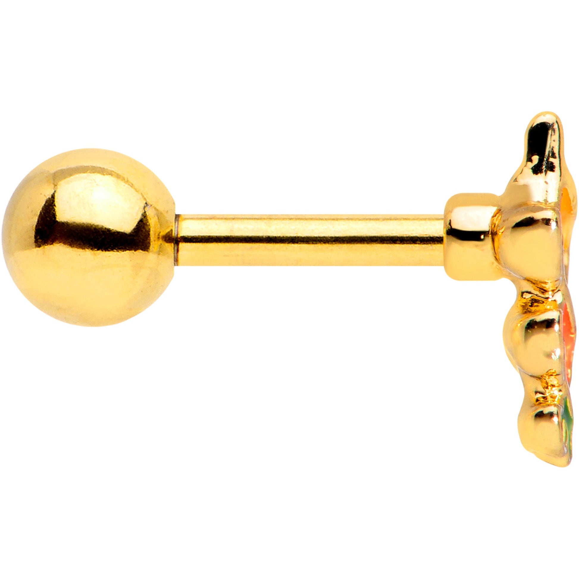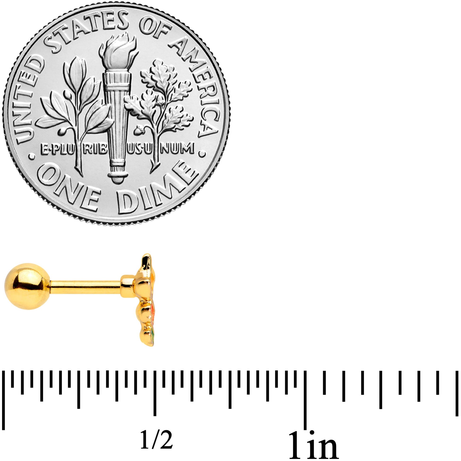 You're totally going to fall for this 16 gauge cartilage stud! It's made with a 6mm gold tone PVD over 316L surgical grade stainless steel straight barbell with a 4mm ball ends. It features a charm of three abstract forms, inspired by the falling leaves. They're yellow, orange, and green and set in descending size order for maximum visual impact. You can even wear this in multiple piercings including tragus, helix, and some conch piercings! This autumn, grab some cartilage jewelry that you're sure to fall in love with!Specifications