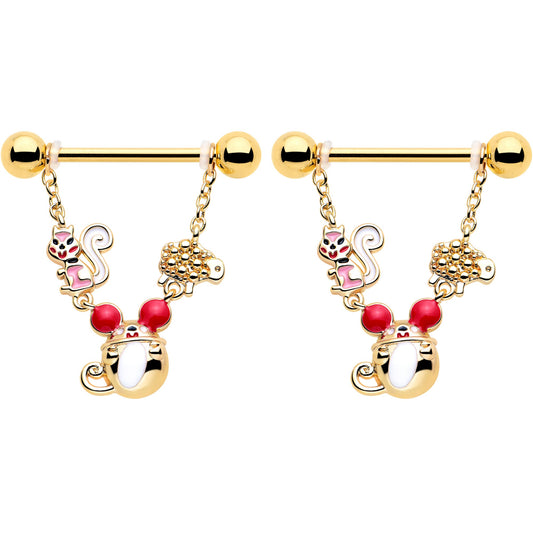 14G 9/16 Gold Tone Mouse Sheep Squirrel Dangle Nipple Ring Set