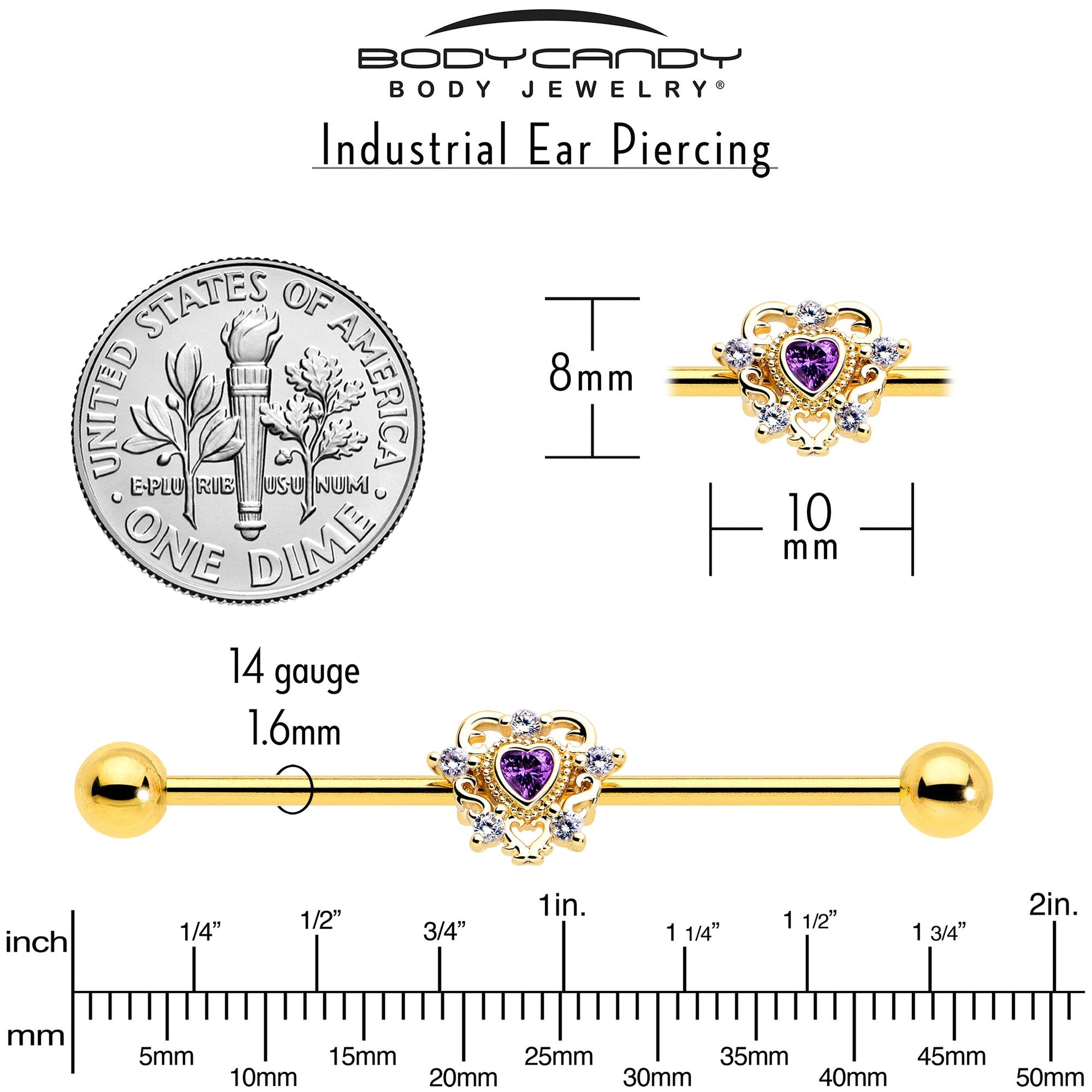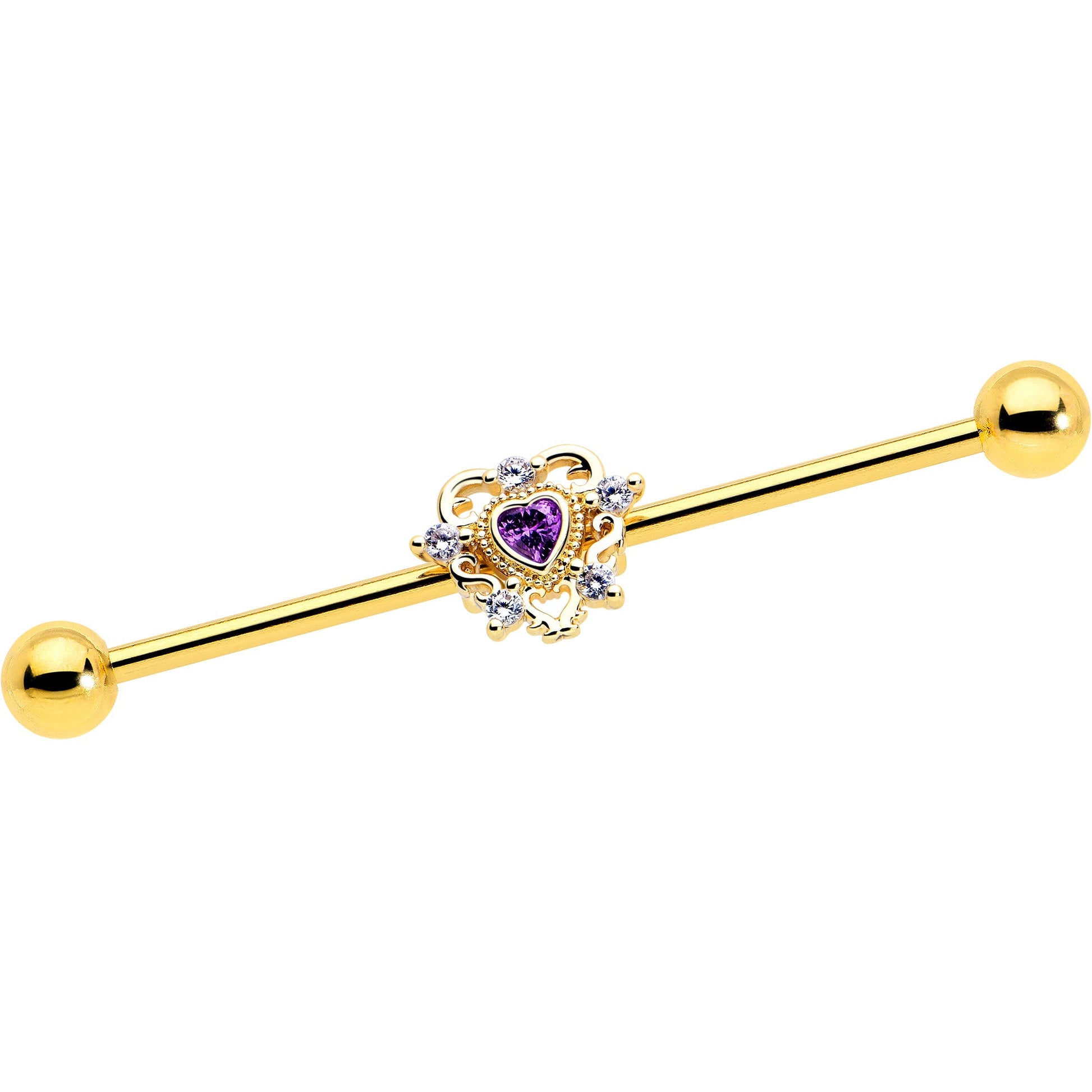 14G Purple CZ Gem Gold Tone Heart of Love Industrial Barbell 38mm