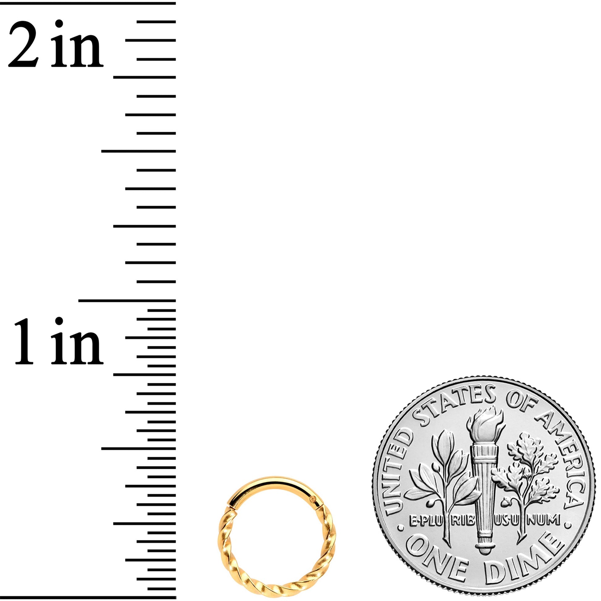 Add some twisted style to your piercings with this 16 gauge clicker ring! It's made with an 8mm gold tone PVD over 316L surgical grade stainless steel hinged curved barbell. It features a simple but striking twisted design that's basic but never boring. You'll love how the clicker design makes it super easy to insert and remove and you can wear it in multiple piercings including daith, tragus, helix, septum and eyebrow! Now that's a twist you're sure to love!