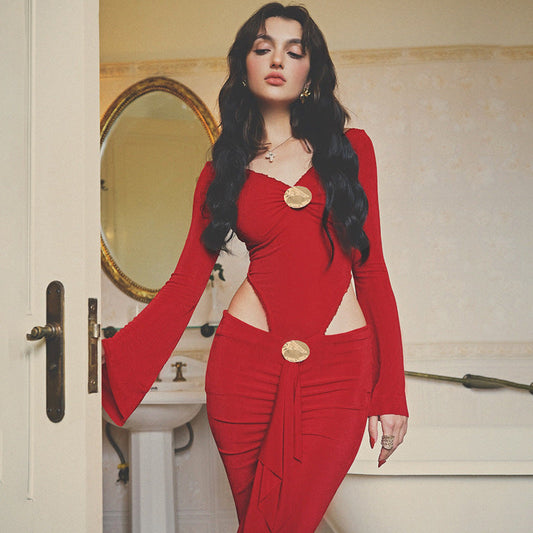 Graceful Women Metal Decorative Long Sleeved Jumpsuit Split Skirt Long Skirt Hollow Out Cutout out Cropped Two Piece Set