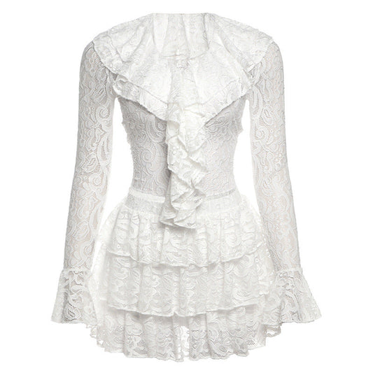 Women Clothing Autumn Slim Fit Sexy Flare Sleeve Ruffled Long Sleeve Lace Hollow Out Cutout out Skirt Two Piece Sets