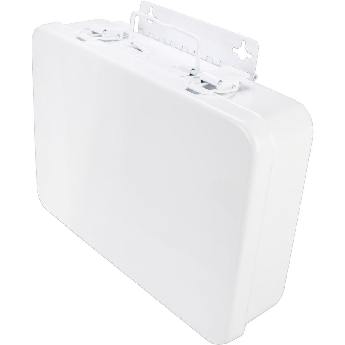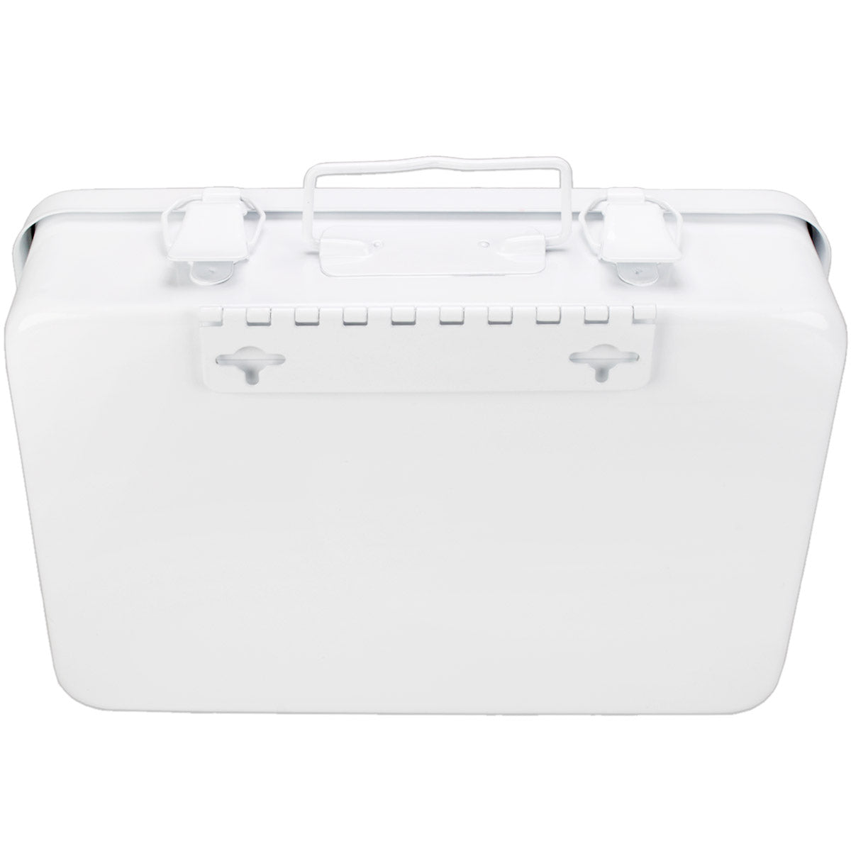 This horizontally configured empty metal first aid case features 1 shelf, hinges and a gasket. Holds up to 16-units of product.