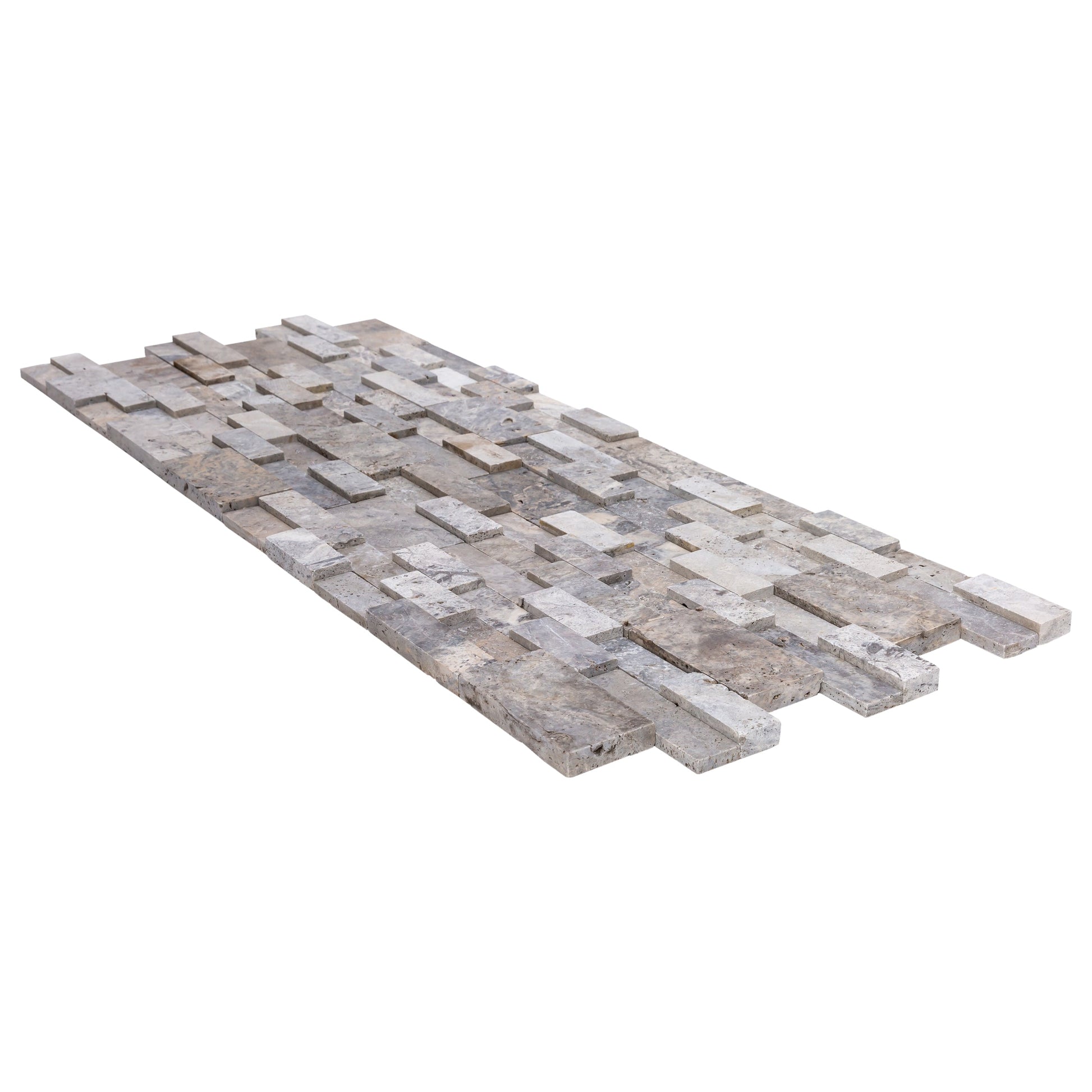 Silver Ledger 3D Panel 6"x24" Natural Travertine Wall Tile - Full Truckload offers dark and light gray colors with hints of beige for unstoppable design versatility. Featuring multiple sized rectangular stones in varying thicknesses, this panel adds interest and dimension to any space.