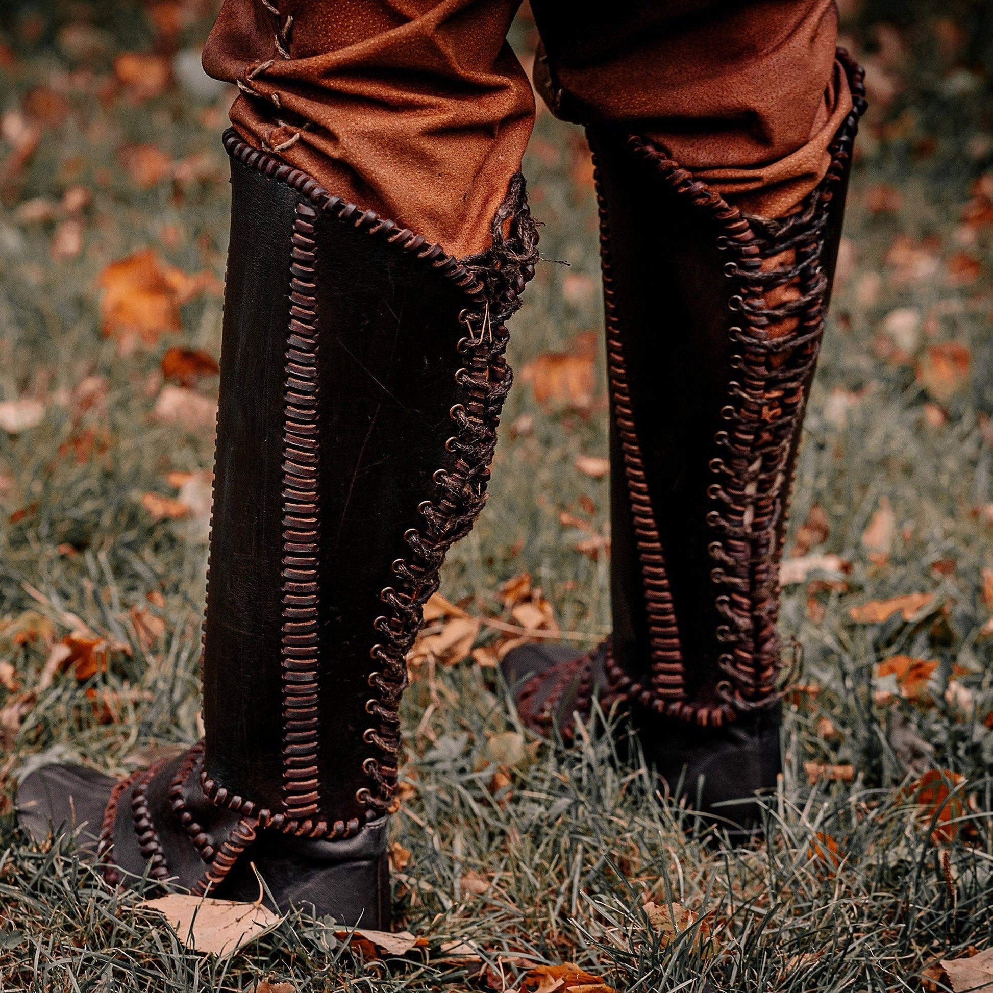 Leather shin guards for LARP/cosplay made by SokolWorkshop. Artificial aging creates effect of old age. Can be made of leather in different colors (choose options).