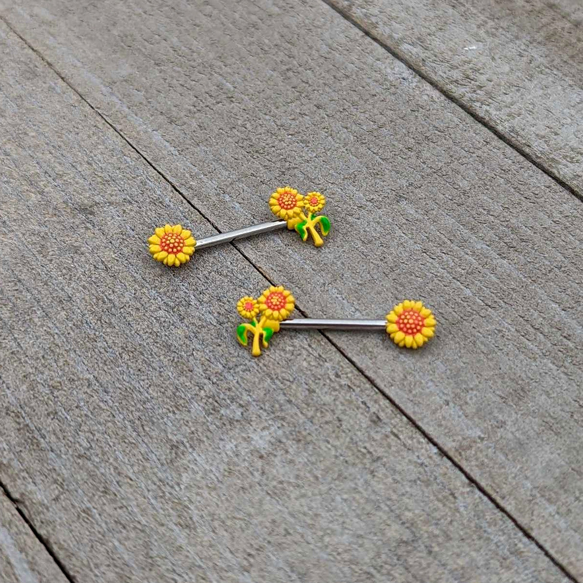 The sun is out...and it's brought some friends on this 14 gauge nipple jewelry! It's made with 14mm durable 316L surgical grade stainless steel straight barbells. They feature a double yellow sunflower charm with textured detailing at their centers. They're further embellished with a pair of green leaves while the opposite end features a single sunflower charm in full bloom. Make every day a sunny day with these striking sunflower nipple piercing rings! Sold as a set of two.