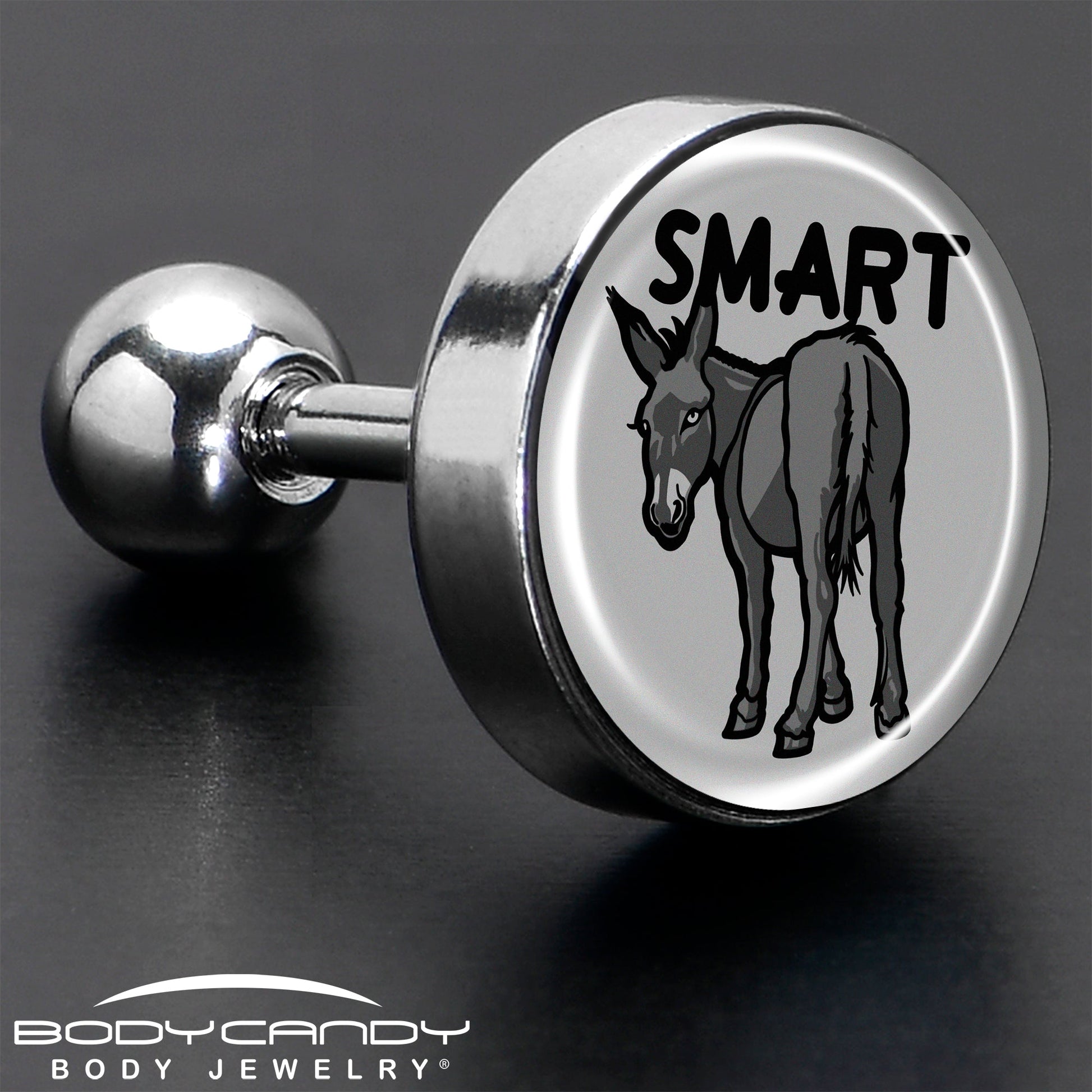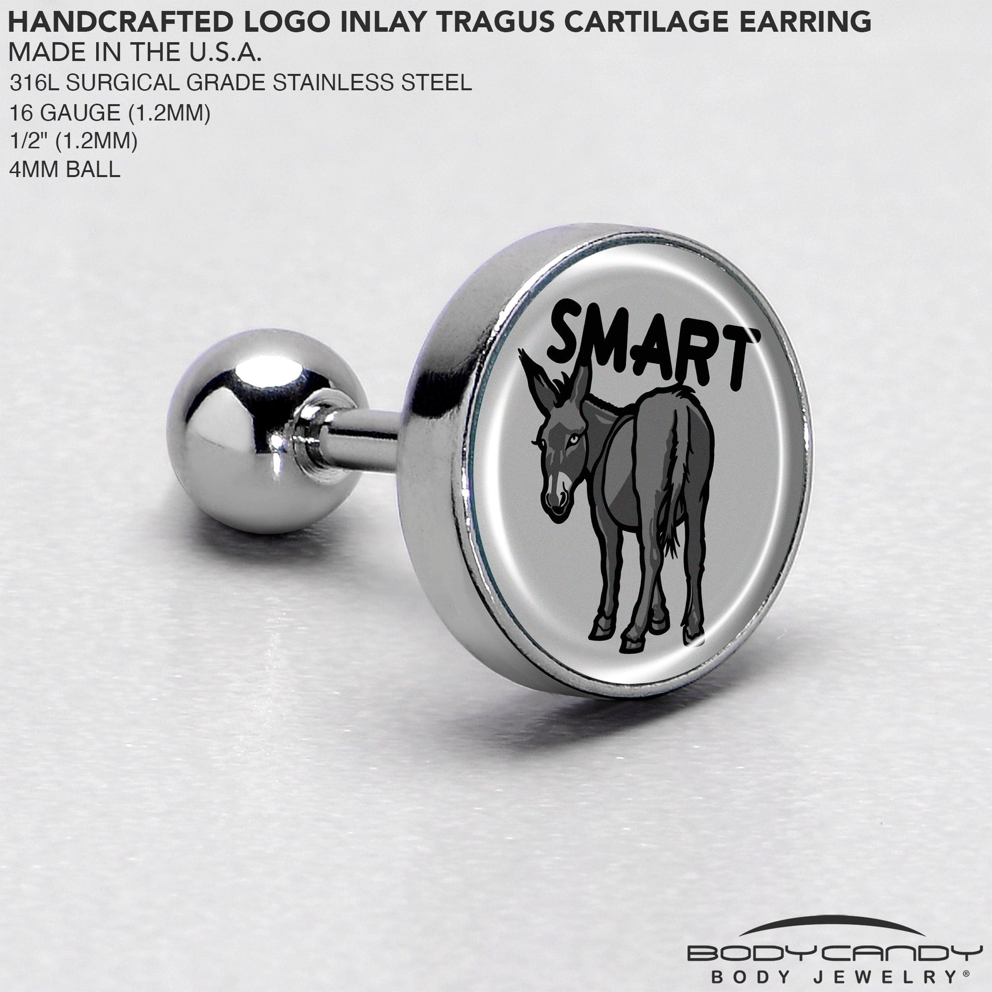 Give your look some sass with the smart ass on this 16 gauge tragus stud. It's made with a 6mm durable 316L surgical grade stainless steel straight barbell with a 4mm ball end. It features a grey disc charm. It features a donkey with a the word "smart" over it, for a clever bit of wordplay that's sure to get some laughs. You can even rock it in multiple piercings including tragus, helix, and some conch piercings. Get some smartass style with the delightful donkey on this cartilage piercing jewelry.