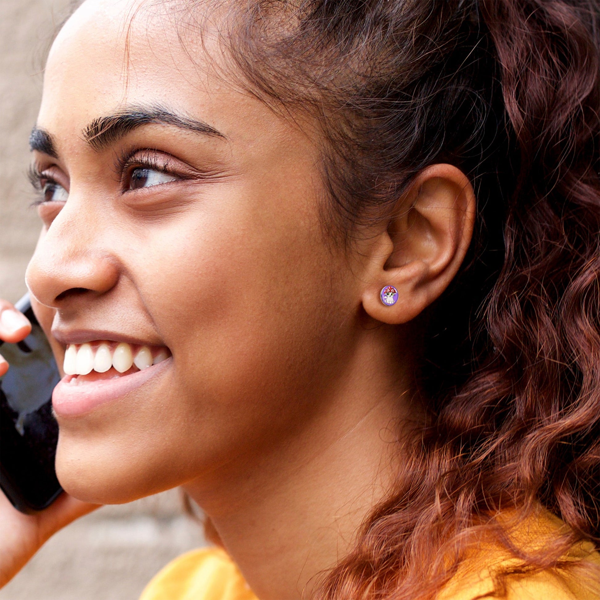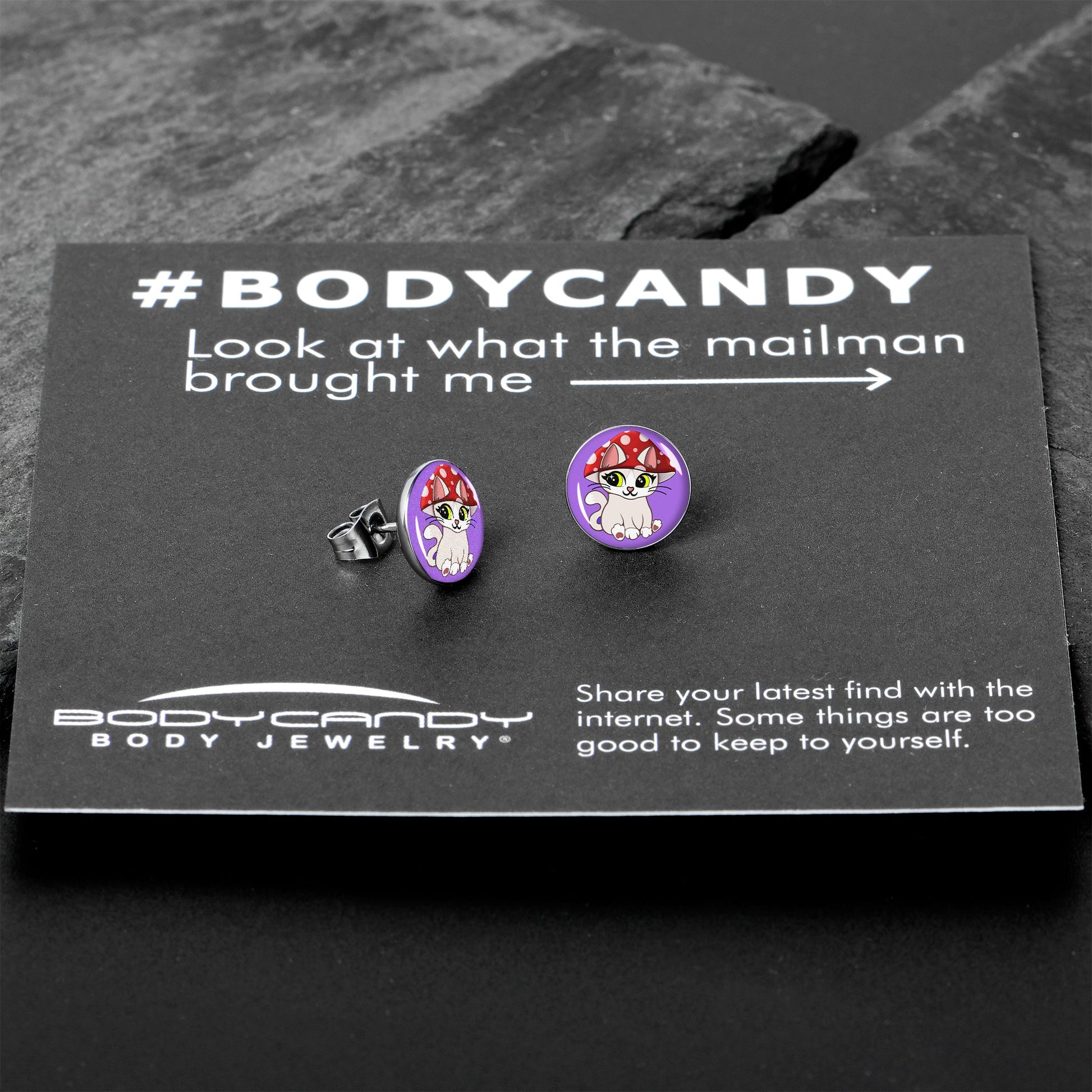Rock a funky fungus like the cat on these earrings for pierced lobes. They are made with stainless steel straight posts with friction backs for a secure fit. The front end each features a disc shaped charm. They have a purple background and featuresa kitty cat, with endearingly wide eyes. The cats are each wearing a red and white mushroom for a hat, for an effect that is as trippy as it is adorable. Trip out on these charmingly psychedelic stud earrings. Sold as a set of two.