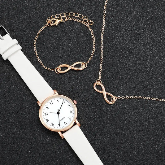 3pcs/set Women Leather Simple Quartz Watch with Number 8 Bracelet Necklace Set